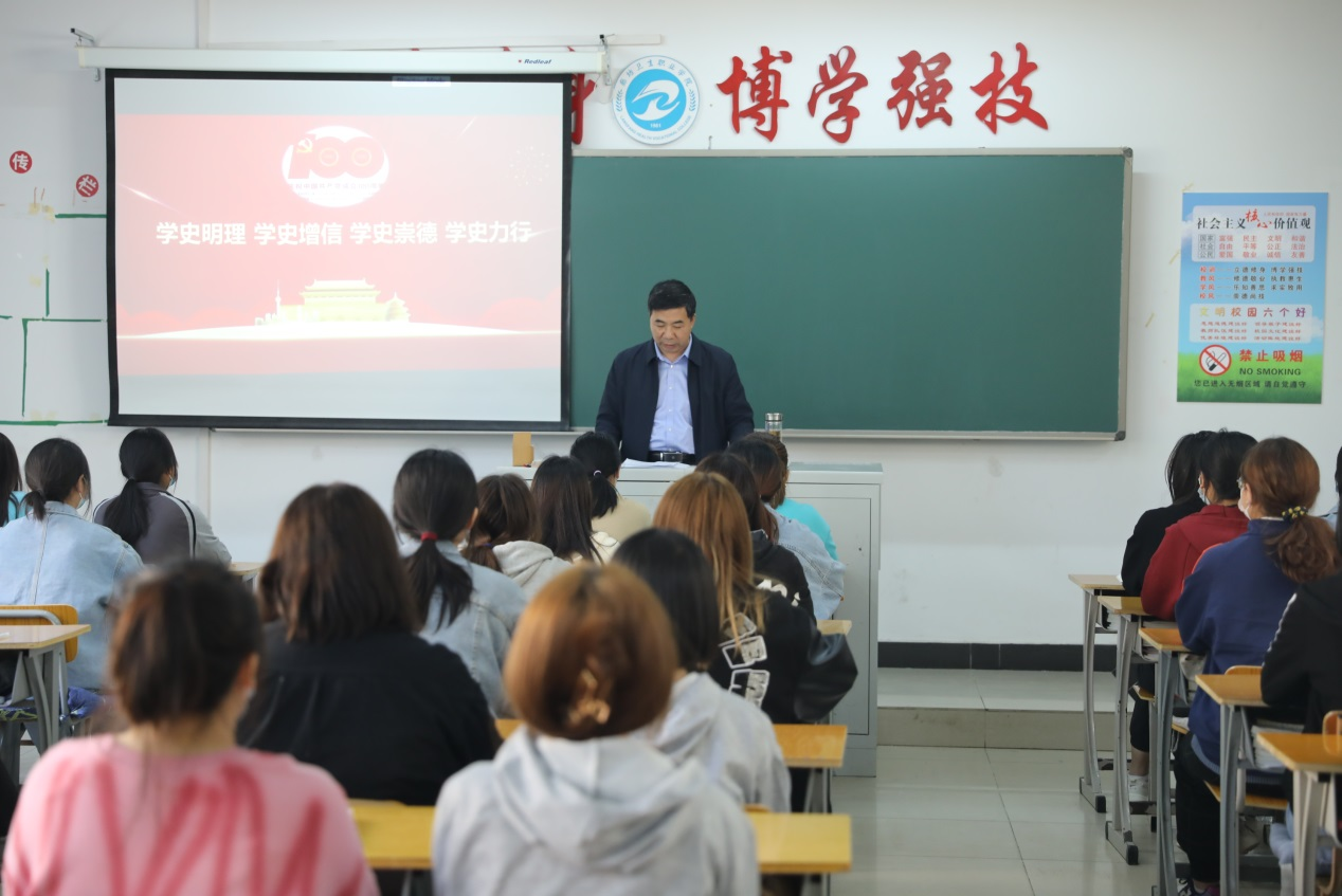 为从党的百年伟大奋斗历程中汲取继续前进的智慧和力量,深入学习贯彻习近平新时代中国特色社会主义思想,推动党史学习教育往深里走、往心里走、往实里走。按照学院党史学习教育宣讲统一安排部署,4月19日上午,党委书记曹希恩深入护理2020-2班开展调研座谈,为师生作党史学习教育专题宣讲报告。他围绕“为什么学——深刻领会开展党史学习教育的重大意义”、“学什么——全面了解中国共产党百年奋斗的光辉历程”、“怎么学——准确把握党史学习教育的重点和工作要求”三个方面内容进行了深刻阐述。