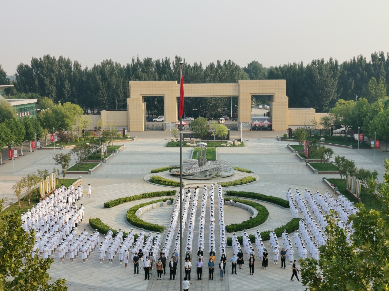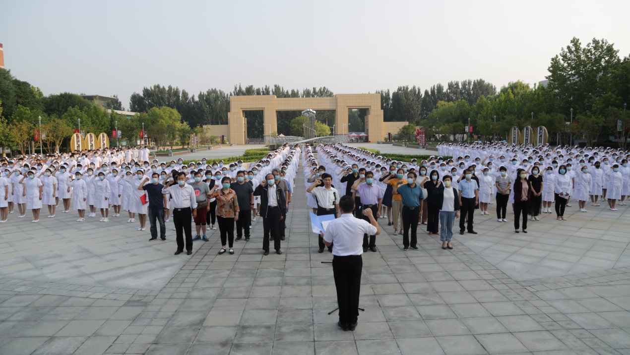 学院全体班子成员、中层处级干部与护理系500余名师生一同升国旗、奏国歌,全体学生面向国旗庄严宣读中国医学生誓言,时刻牢记:我是中华人民共和国公民,是中国医学生,主动践行誓言,志愿献身医学,热爱祖国,忠于人民,恪守医德。学生代表和教师代表作了精彩发言。