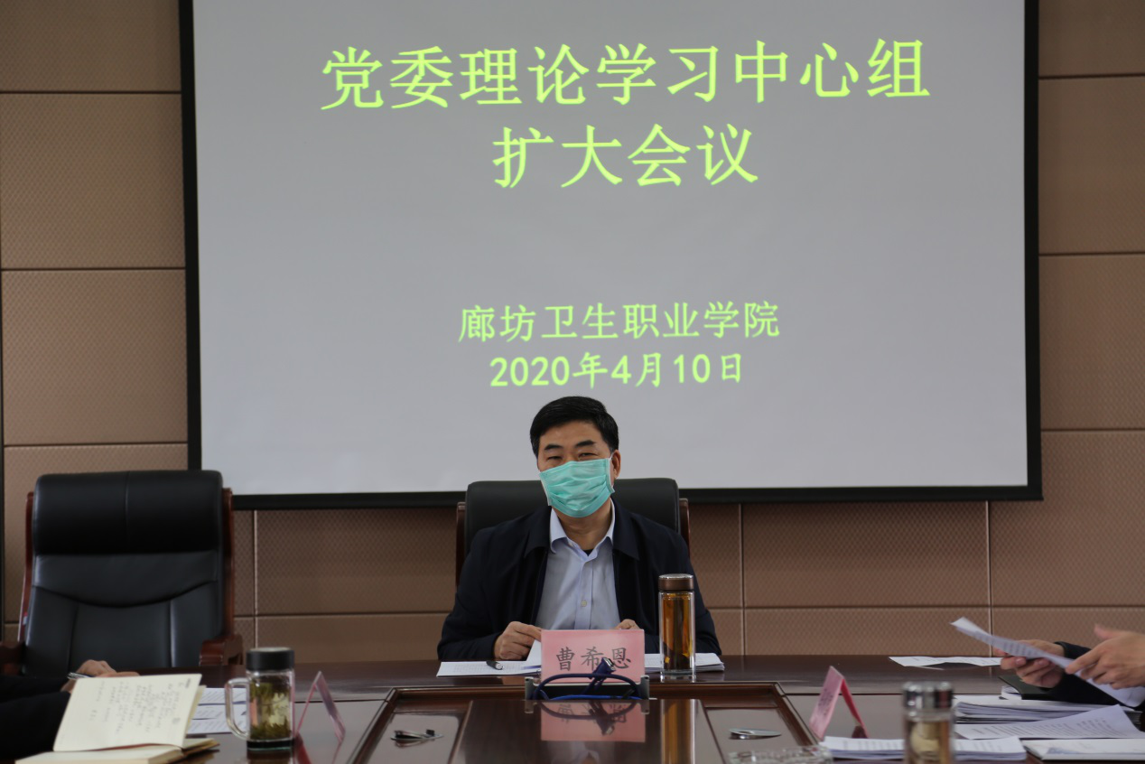 4月10日上午,学院党委理论学习中心组在304会议室召开学习(扩大)会议。党委书记曹希恩主持会议并作主题发言,党政领导班子成员参加会议,中层处级干部列席会议。