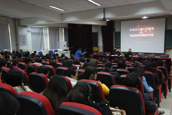宇文宏教授首先以日本“软铅笔的文化”为切入点,揭示了“软铅笔文化”所阐述的人生哲理。随后,宇文宏教授结合自己的工作经历、所见所闻,阐述了价值观的基本功用、社会主义核心价值观的基本内容、提出背景及如何培育社会主义核心价值观。接着,宇文教授通过列举实例,指出了核心价值观在学生社会化、成长成才和人格塑造等多方面所起的至关重要的作用。最后,宇文教授就“师德与教师职能”、“师德与教师职业规范”和“教师育人的原则和方法”等问题进行了精彩的论述,指明了高校“人师”应具备的专业能力,为我院教职工今后全面提高教师的教育教学能力和专业素质指明了方向。