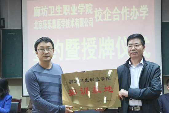 2014年10月9日下午,廊坊卫生职业学院与北京乐乐嘉医学技术有限公司校企合作签约暨授牌仪式在学术报告厅隆重举行。学院党委书记郝锁来、院长刘更新、党委副书记王立志、副院长彭丽红,以及北京乐乐嘉总经理王嘉蕾、人力资源部主任邓培林、行政部副主任董雅辉出席仪式。仪式由副院长彭丽红主持。