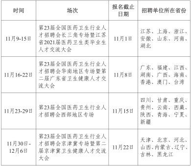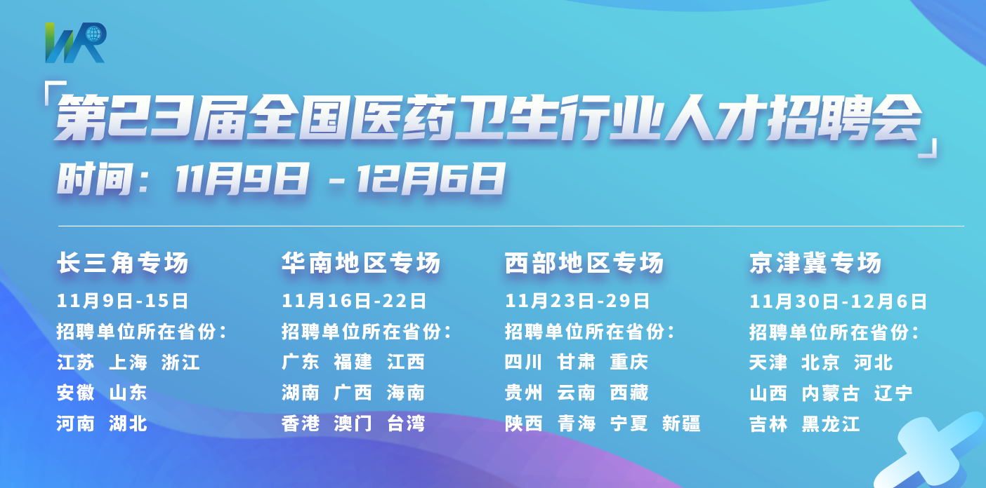 为贯彻落实党和国家就业优先政策相关要求,切实做好新冠肺炎疫情防控常态化下卫生健康行业人力资源服务,促进人才就业,国家卫生健康委人才交流服务中心联合各省市相关卫生健康行政部门,并协同各地医疗卫生机构和医药院校,定于2020年11-12月在线举办第23届全国医药卫生行业人才招聘会。
