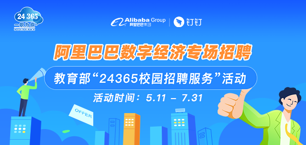 2020年5月11日-7月31日,由教育部高校学生司指导、全国高校学生信息咨询与就业指导中心主办、阿里巴巴集团承办“24365校园招聘服务”阿里巴巴数字经济专场招聘,目前钉钉专场已有16万+企业、40万+在招职位。