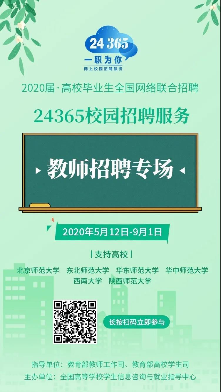 为落实国务院常务会议要求,充实基层教师队伍,稳定2020届高校毕业生就业,按照教育部就业创业工作领导小组会议要求,教育部教师工作司、高校学生司于今日共同推出“24365全国教师专场招聘活动”,目前活动已汇集多家知名中小学等教育机构参与招聘。