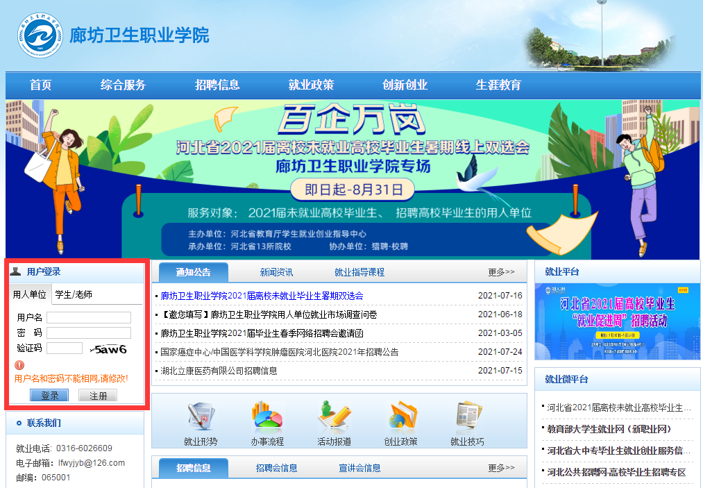 用人单位报名参会,请登陆廊坊卫生职业学院官网—点击“招生就业”—点击“就业信息网”--进入廊坊卫生职业学院就业服务平台,在左上角找到用人单位登录及注册窗口,按提示完成用户注册,待学院对用人单位资质审核通过后,用人单位可登录就业服务平台,在个人中心界面中,完成招聘信息的发布与管理。