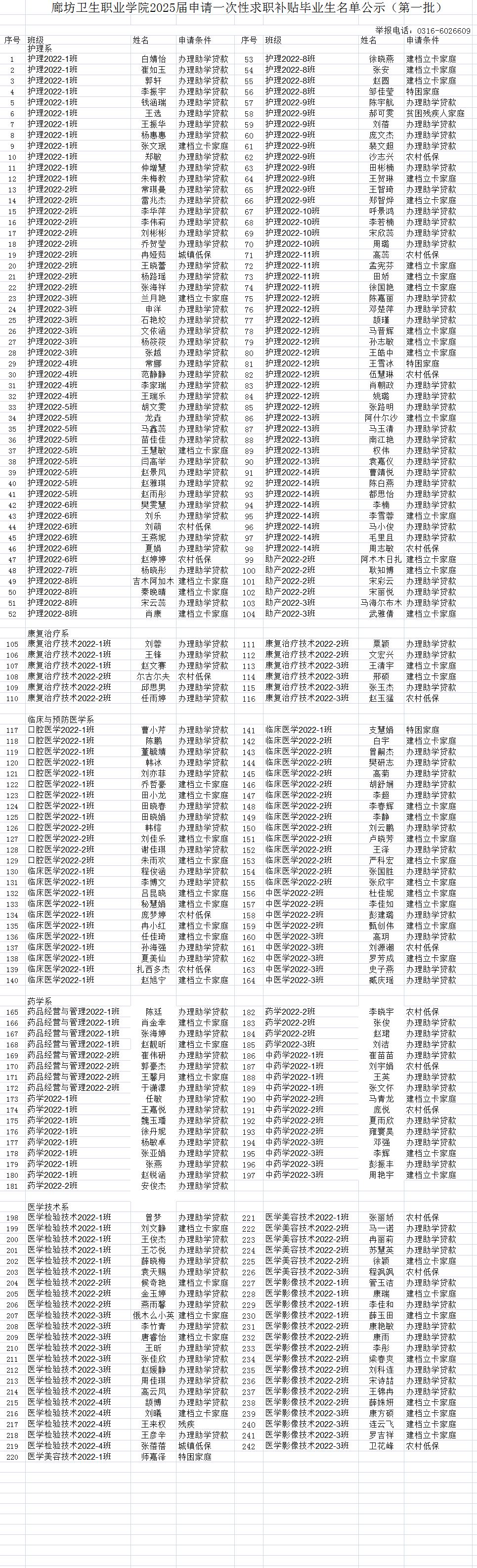 廊坊卫生职业学院2025届申请一次性求职补贴毕业生名单公示(第一批)