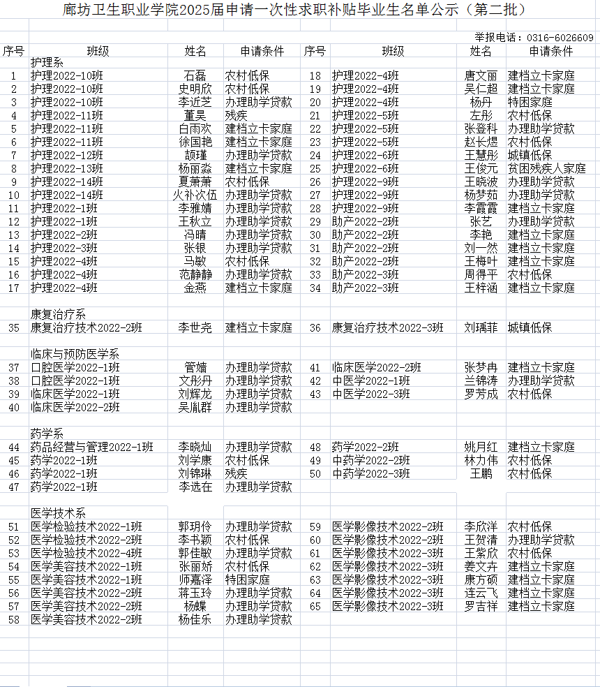 廊坊卫生职业学院2025届申请一次性求职补贴毕业生名单公示(第二批)