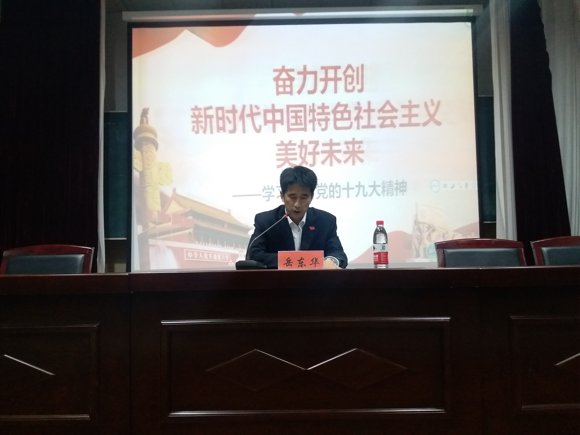 此次宣讲岳东华书记从十九大都完成了哪些任务、重点要把握的内容、十九大最大的亮点是什么以及怎么学、学什么等四个方面对党的十九大报告进行了详细解读,将习近平总书记治国理政新理念新思想新战略概括为习近平新时代中国特色社会主义思想这一党的十九大的灵魂进行了深入浅出的阐述和解读:一是党的十九大的主题及主要成果;二是习近平新时代中国特色社会主义思想,中国特色社会主义进入了新时代;三是我国社会主要矛盾的变化;四是结合实际,希望广大学生立足高远,脚踏实地,为实现两个一百年奋斗目标要不忘初心,牢记使命,奋勇投身新时代,为实现中华民族伟大复兴的中国梦不懈奋斗!
