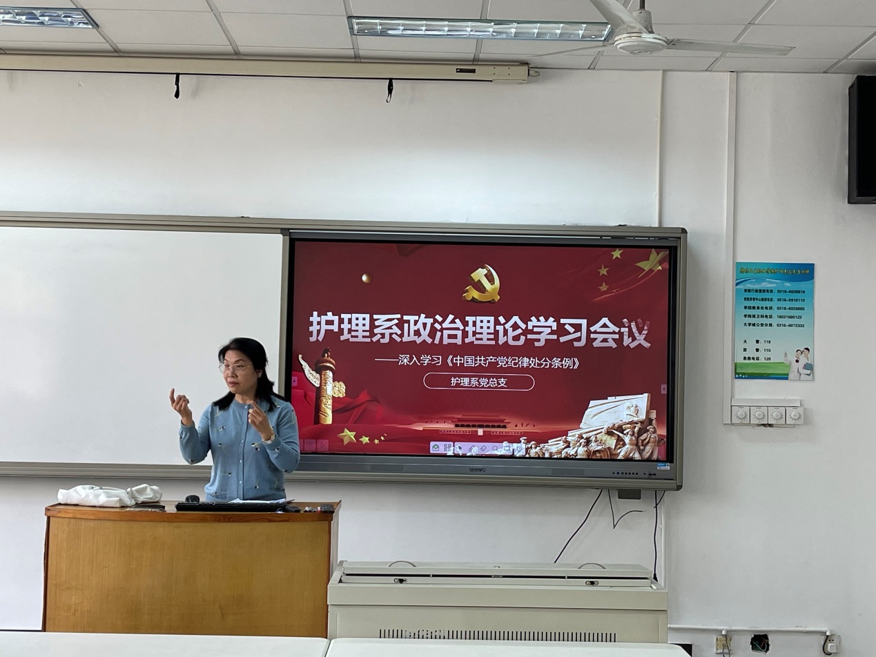 近日,为深入学习习近平总书记关于党纪学习教育的重要讲话和重要指示精神,护理系党总支开展政治理论学习会议,认真学习贯彻修订后的《中国共产党纪律处分条例》,护理系党总支书记张少云同志主持会议,护理系全体党员参会。