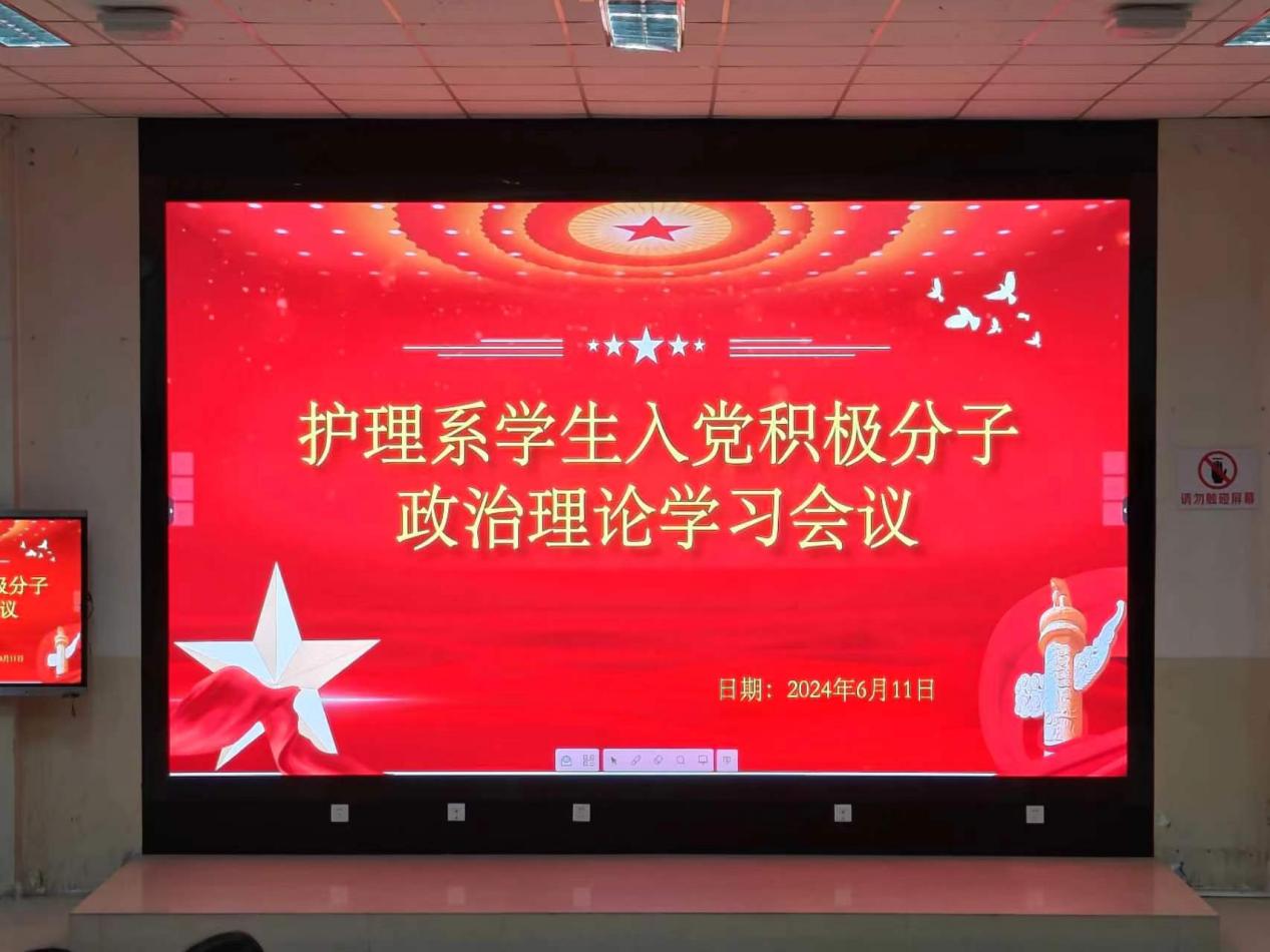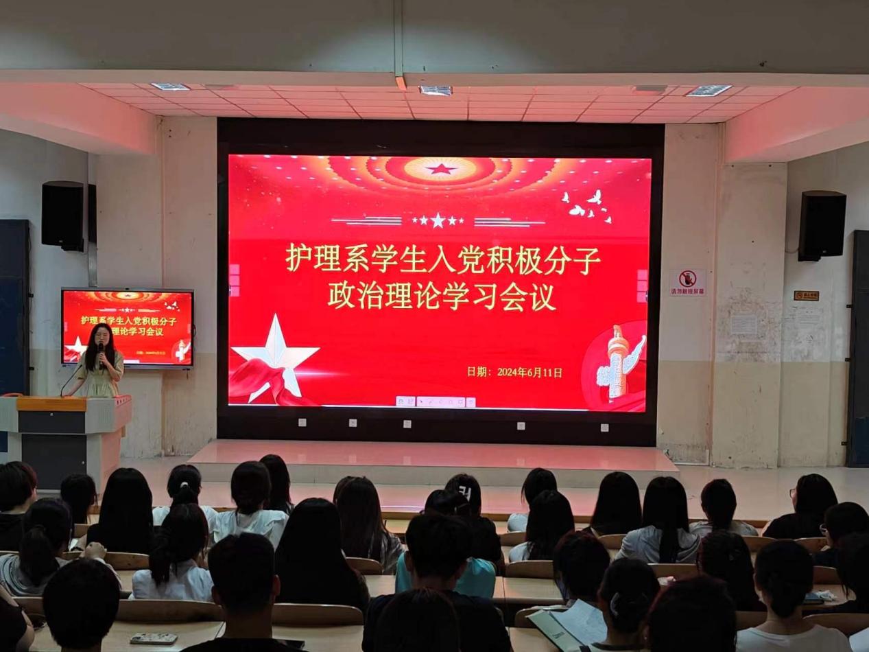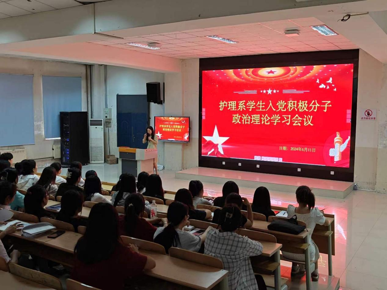 为深入学习习近平新时代中国特色社会主义思想和党的二十大精神,进一步加强护理系学生入党积极分子对党的认识,提高政治素养,护理系学生党支部于2024年6月11日在阶梯教室开展学生入党积极分子政治理论学习会议。