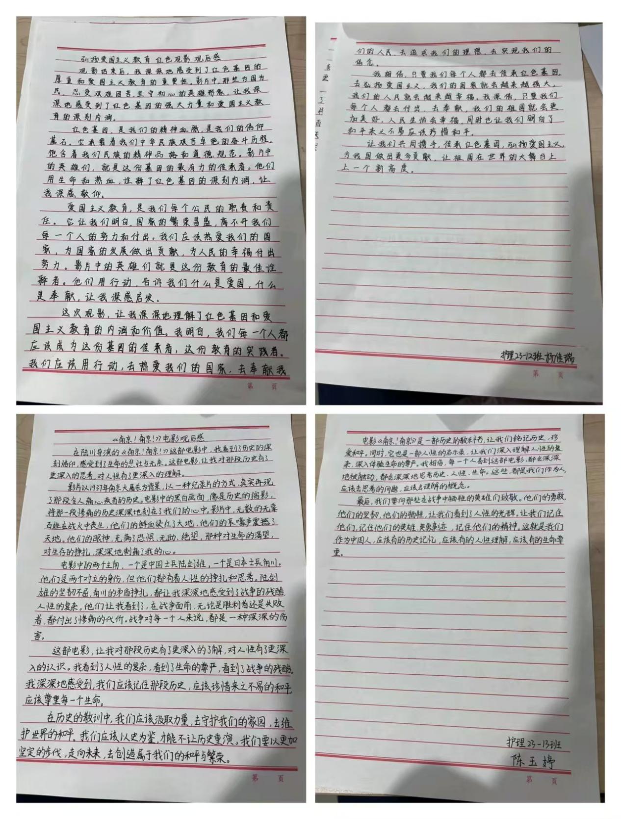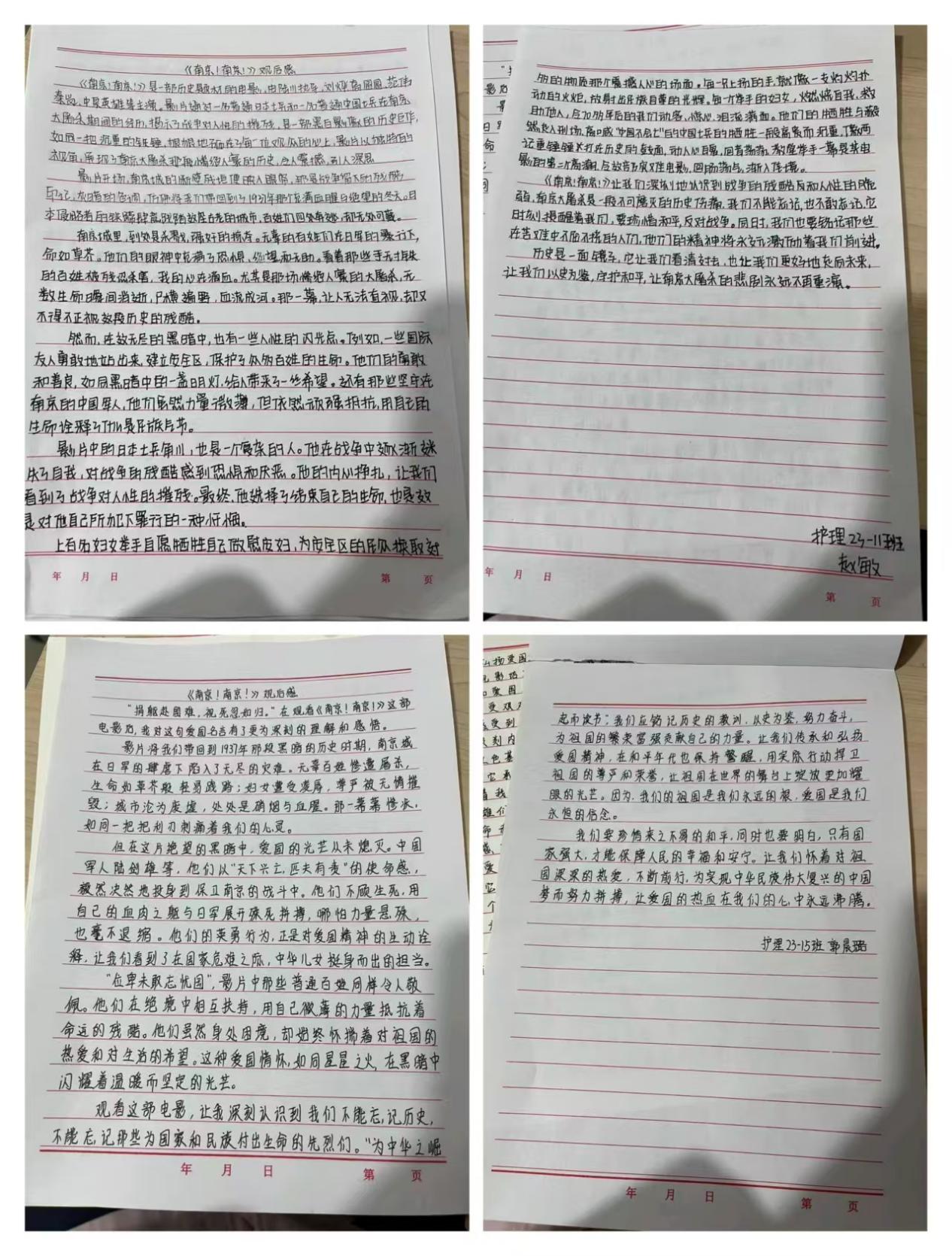 观影过程中,护理系学生们全神贯注。影片里的一幕幕场景深深震撼着大家的心灵,日军的残忍行径令人愤慨不已,而中国人民在绝境中的顽强抗争又让大家备受鼓舞。观看结束后,护理系学生们展开了讨论,分享自己的感受,大家深刻认识到了和平的来之不易,要珍惜当下校园学习生活。学生入党积极分子护理23-11班赵敏、护理23-12班杨佳瑞、护理23-13班陈玉婷和护理23-15班郭晨璐以文字的方式表达了自己的观影感受。