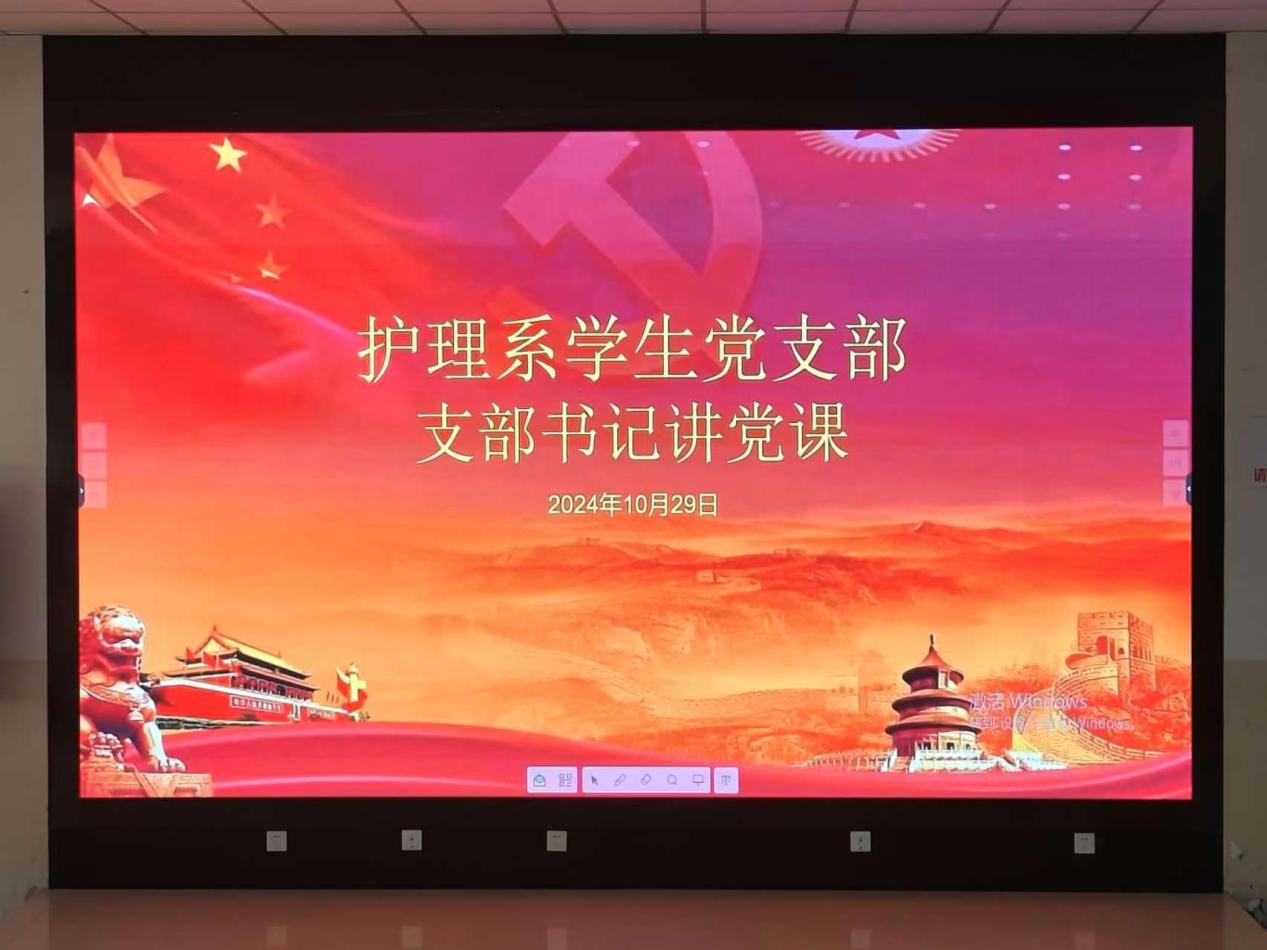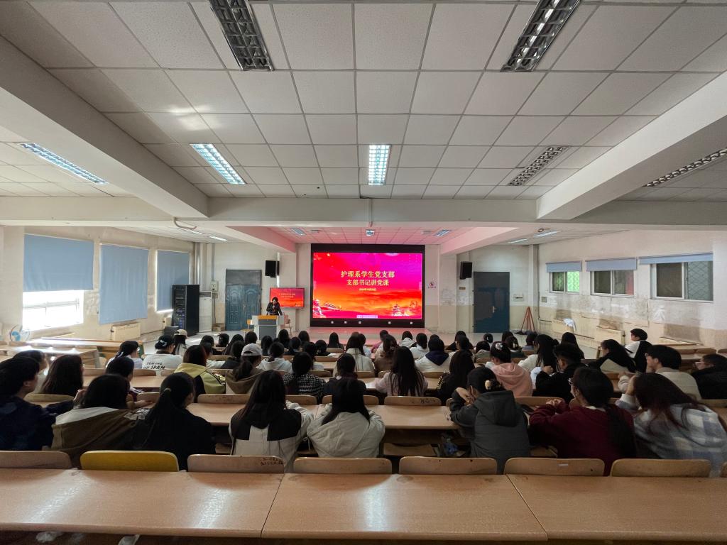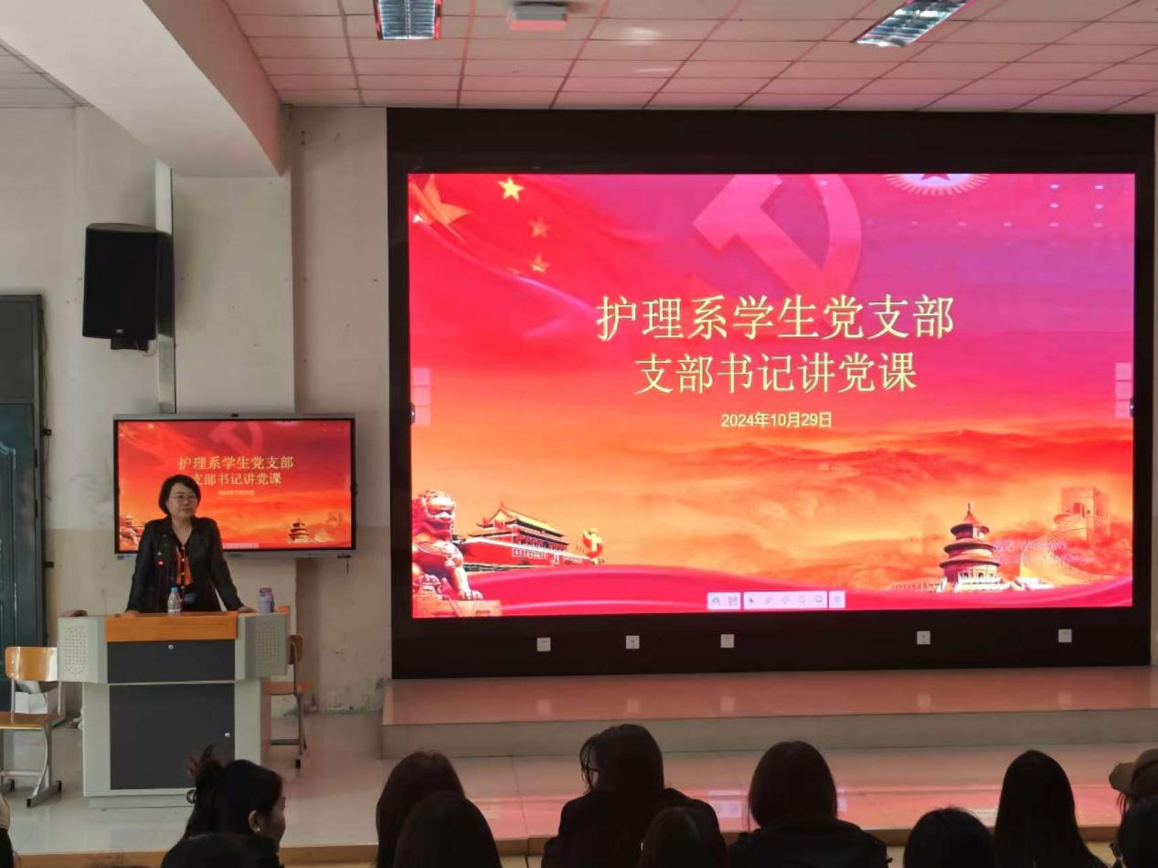 为做好学生入党积极分子的思想建设工作,护理系学生党支部于2024年10月29日在阶梯教室举办了政治理论培训活动,护理系学生党支部书记张萍同志以“坚定理想信念,做新时代有为青年”为主题为护理系学生入党积极分子上了一堂生动的党课。