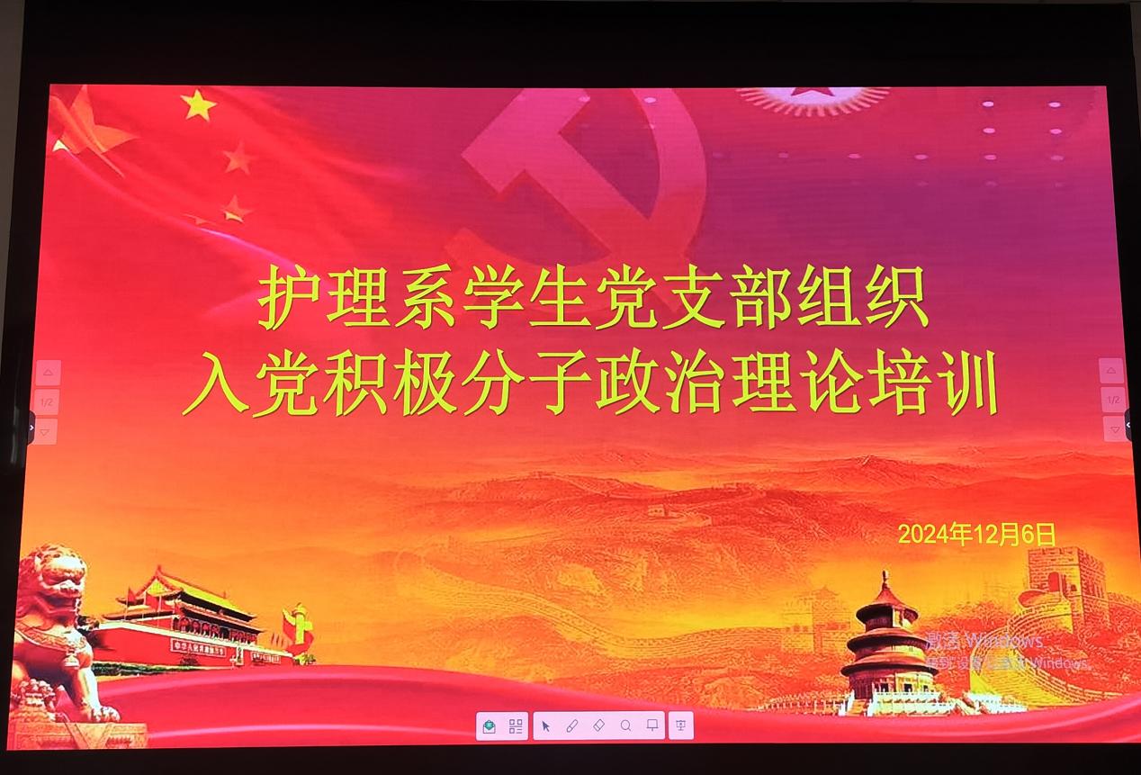 为深入贯彻落实党的二十大精神,引导护理系入党积极分子坚定理想信念,提升政治素养,护理系学生党支部于2024年12月6日在阶梯教室举办了政治理论培训活动。