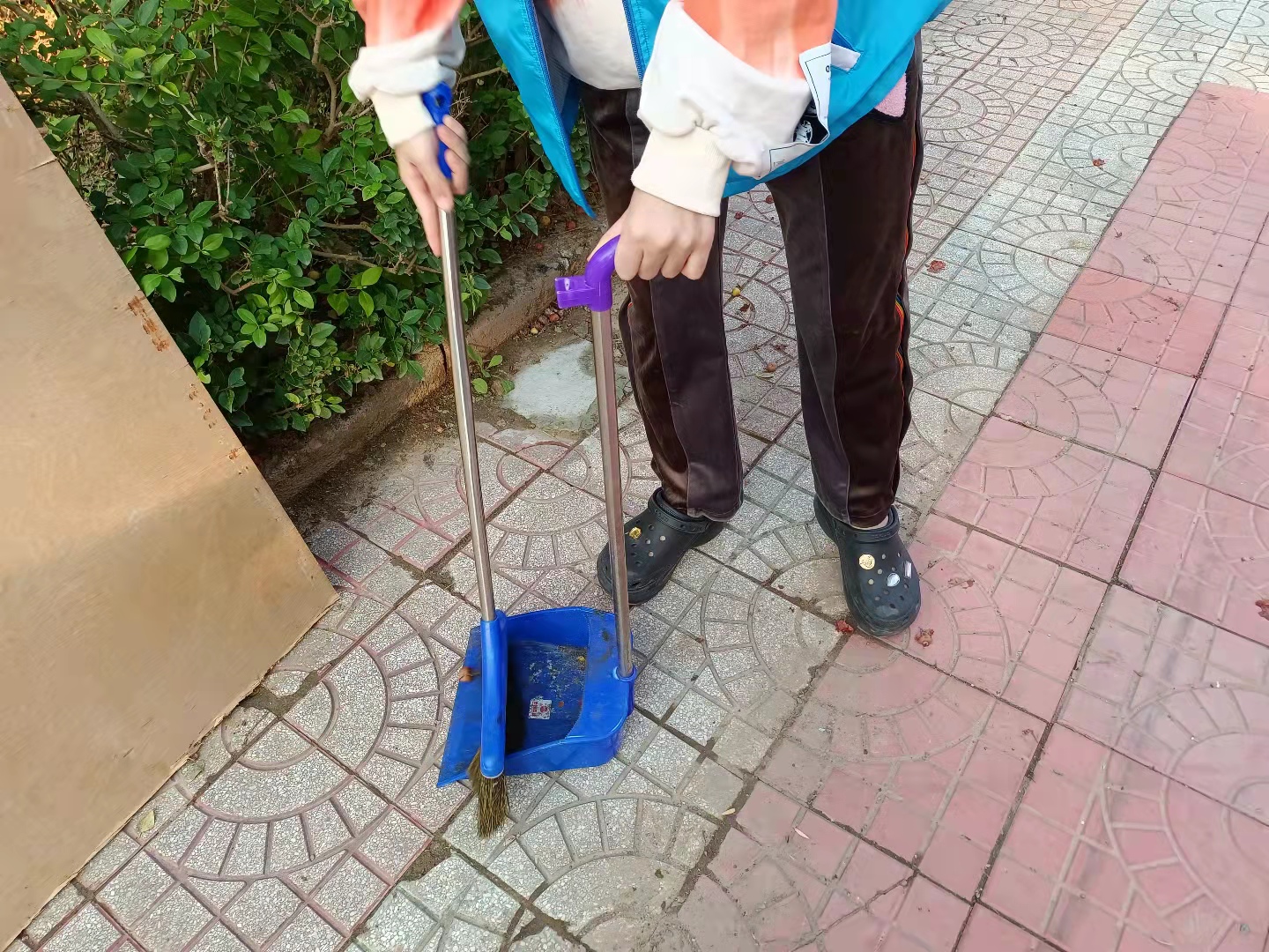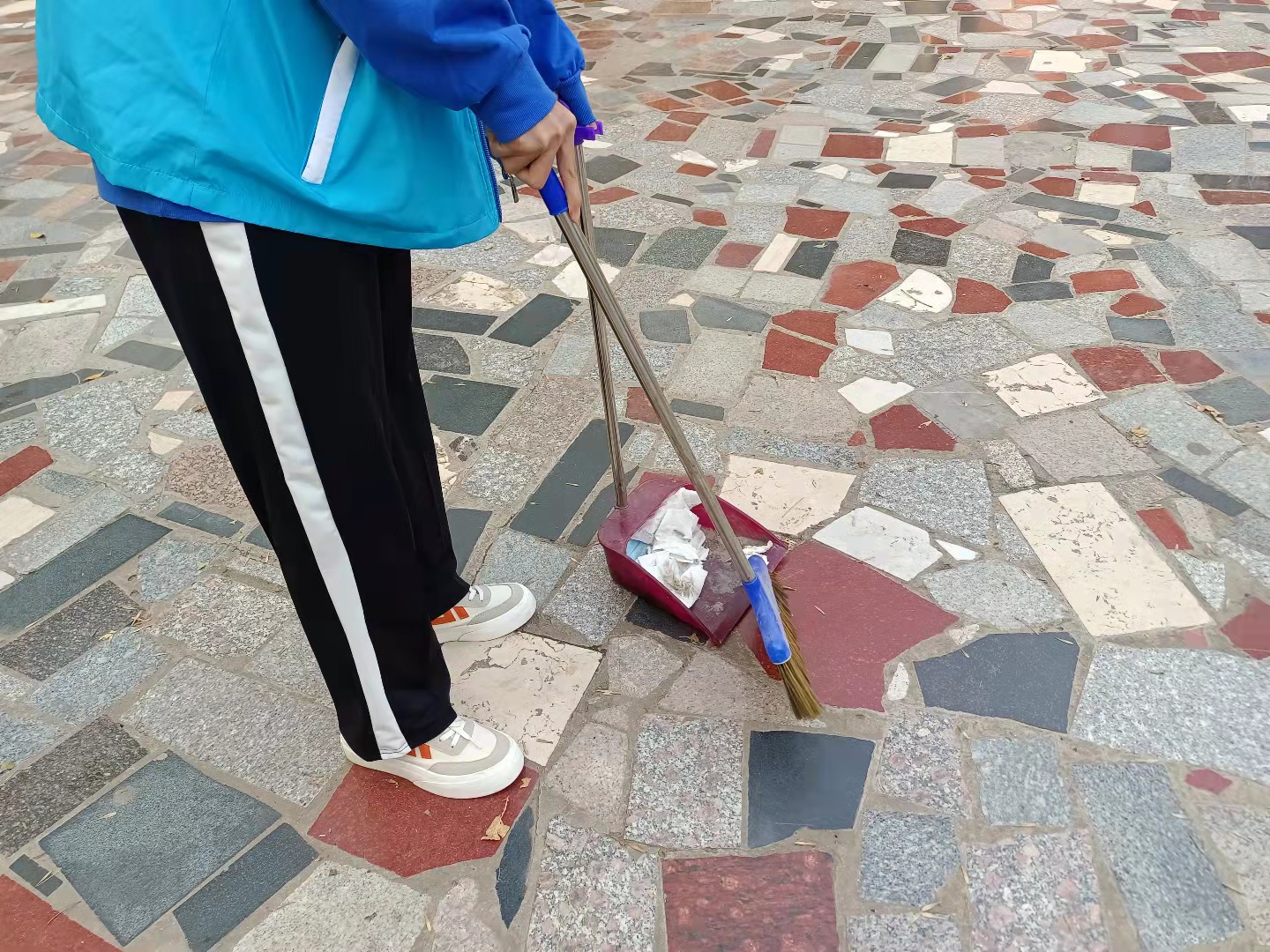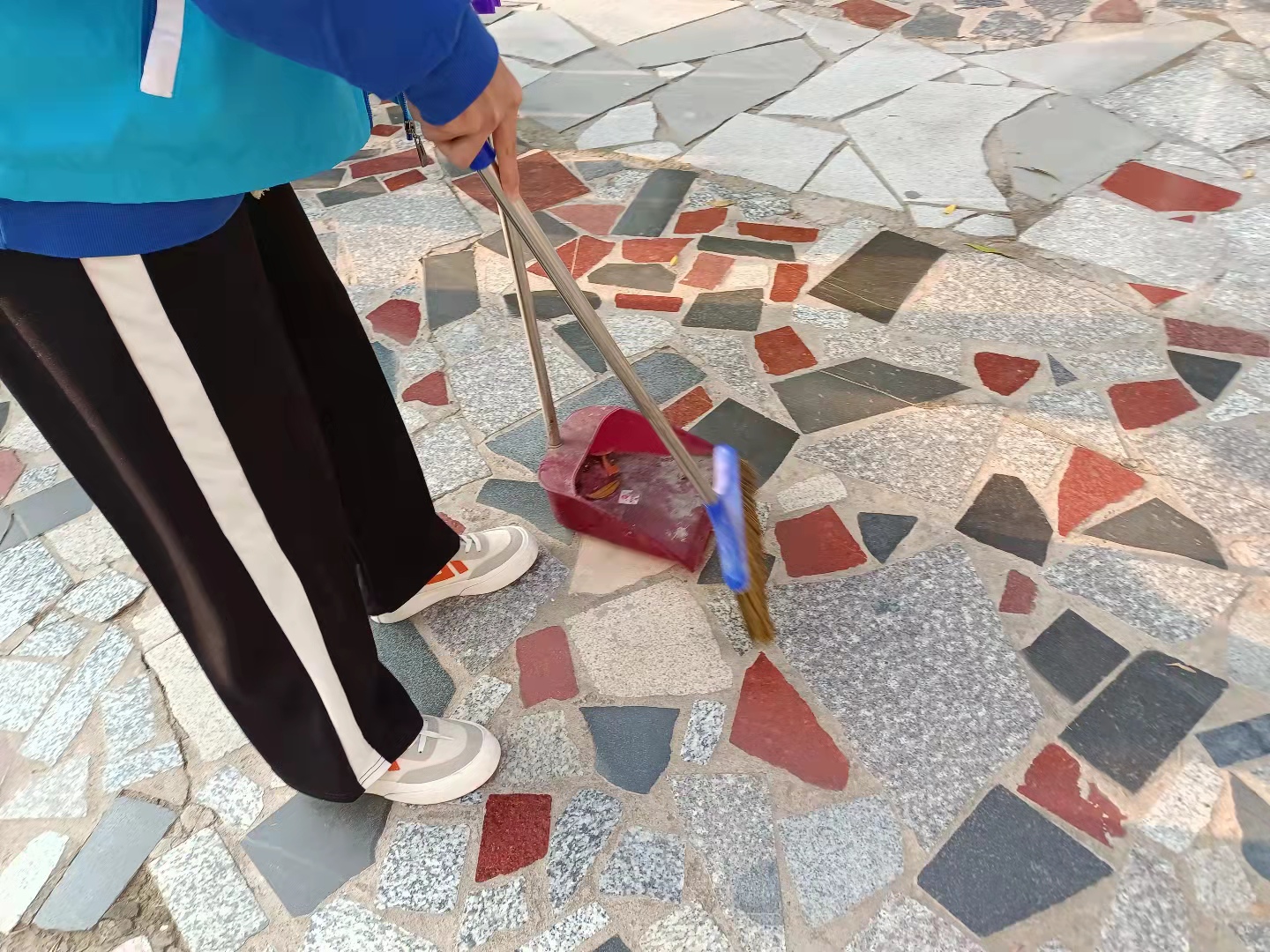 云挡住了太阳,却挡不住同学们工作的脚步。所有同学分成不同的小组,负责不同的工作。在这个清晨,随处可见同学们劳动的身影,街道上、宿舍前、教学楼旁、操场中,甚至是那时常无人问津的小树林内都能看到,这一位位身着白蓝志愿服,手拿清扫工具的“天使”们。