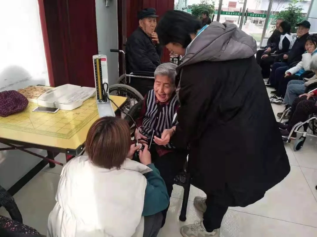 出发前,同学们激动的在阶梯教室前集合,满怀着热情,不负光阴,打扫卫生、陪老人聊天、量血压,志愿者一同为老人们做着力所能及的事,现场其乐融融,十分温馨融洽。