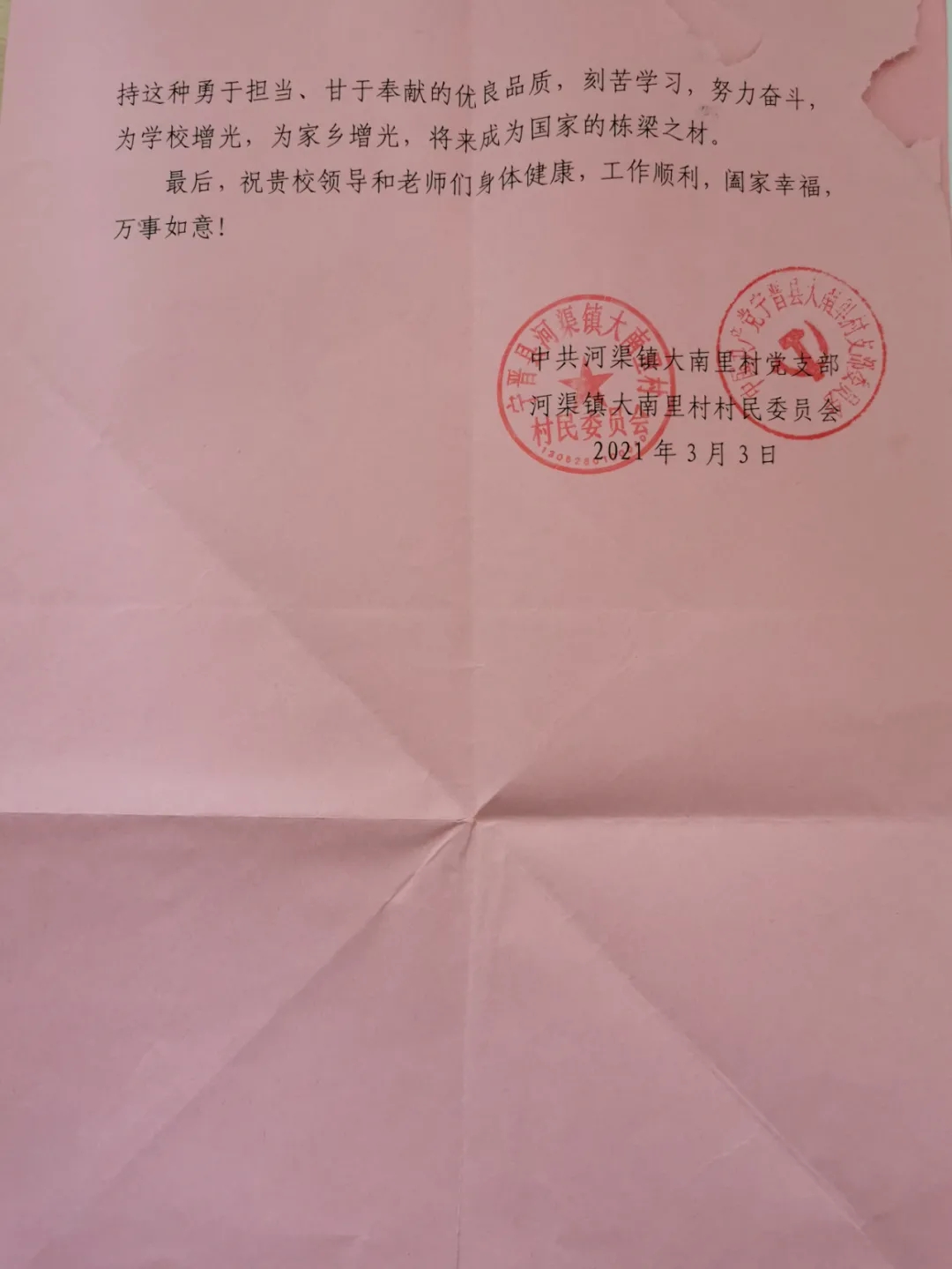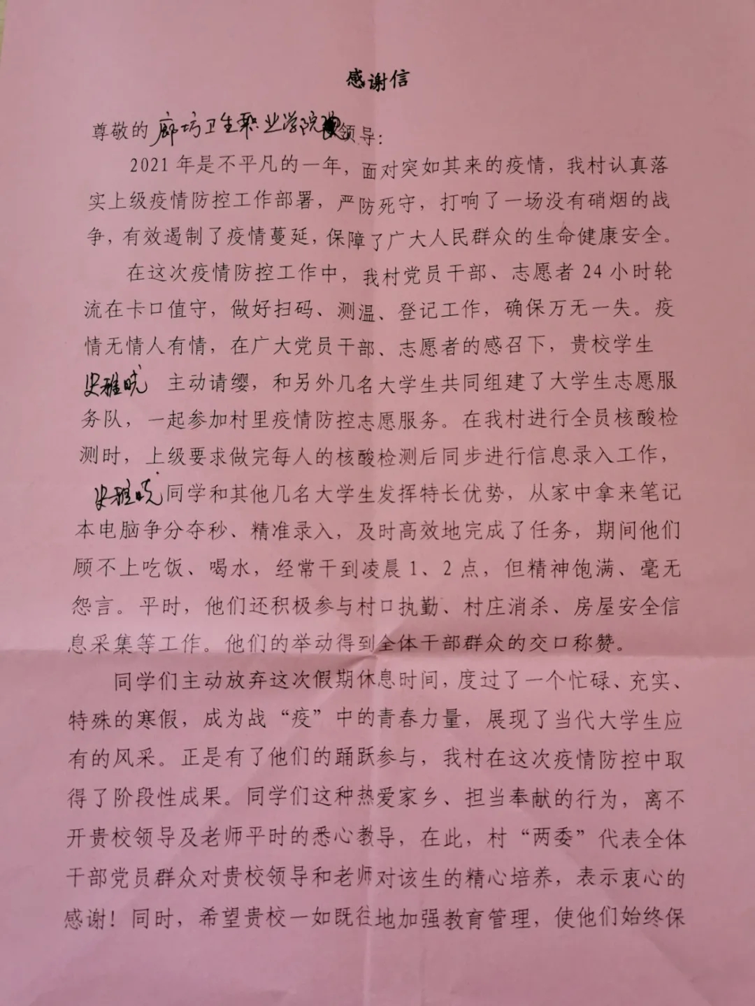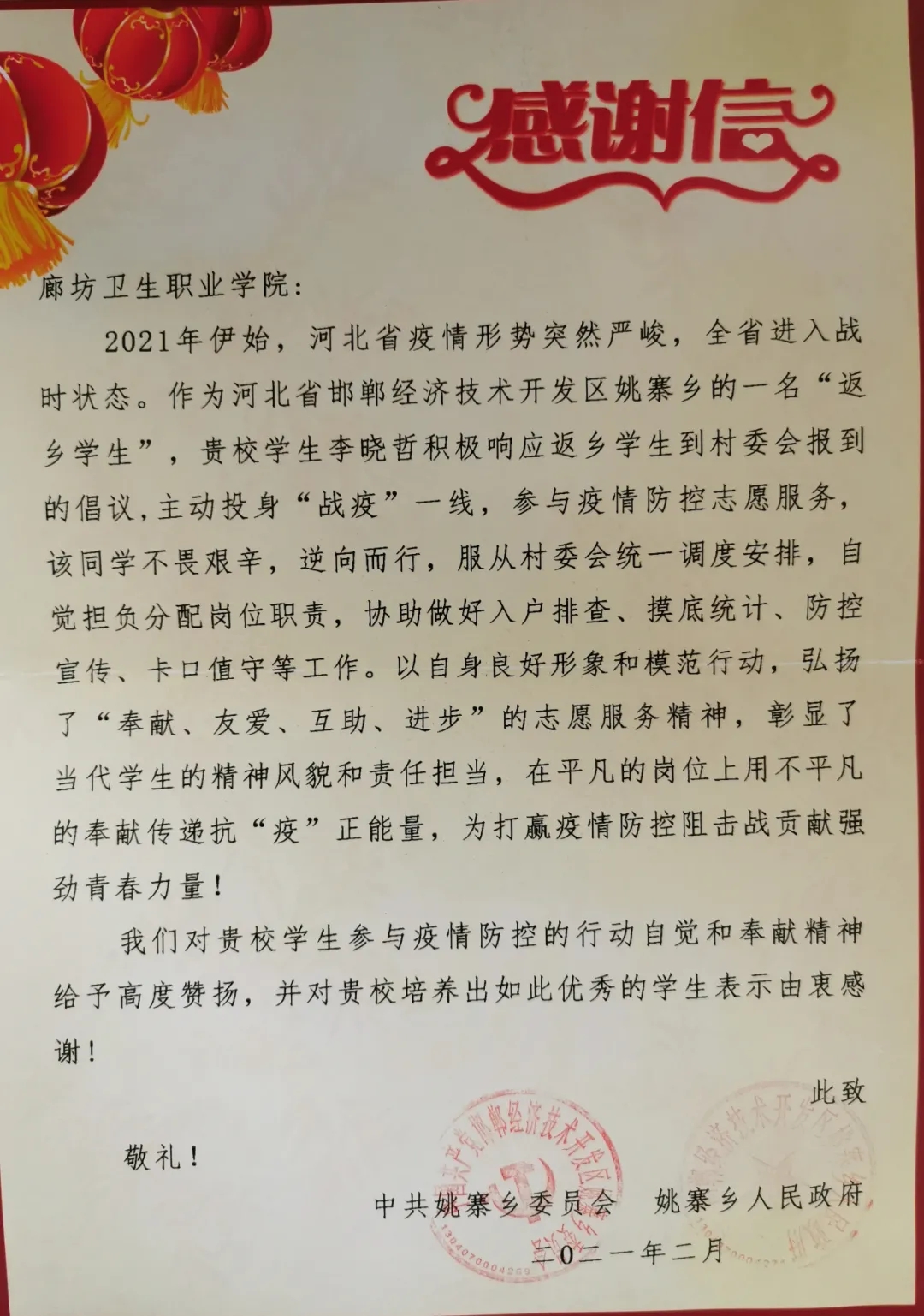 同学们主动放弃这次假期休息时间,度过了一个忙碌、充实、特殊的寒假,成为战“疫”中的青春力量,展现了当代大学生应有的风采。正是有了他们的踊跃参与, 我村在这次疫情防控中取得了阶段性成果。同学们这种热爱家乡、担当奉献的行为,离不开贵校领导及老师平时的悉心教导,在此,村“两委” 代表全体干部党员群众对贵校领导和老师对该生的精心培养,表示衷心的感谢!同时,希望贵校一如既往地加强教育管理, 使他们始终保持这种勇于担当、甘于奉献的优良品质,刻苦学习,努力奋斗,为学校增光,为家乡增光,将来成为国家的栋梁之材。