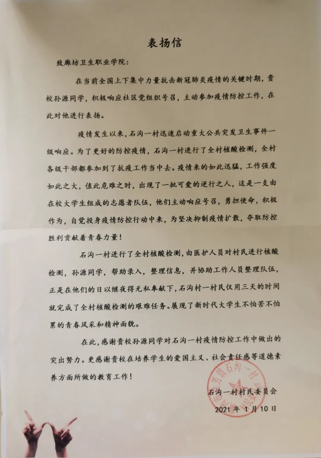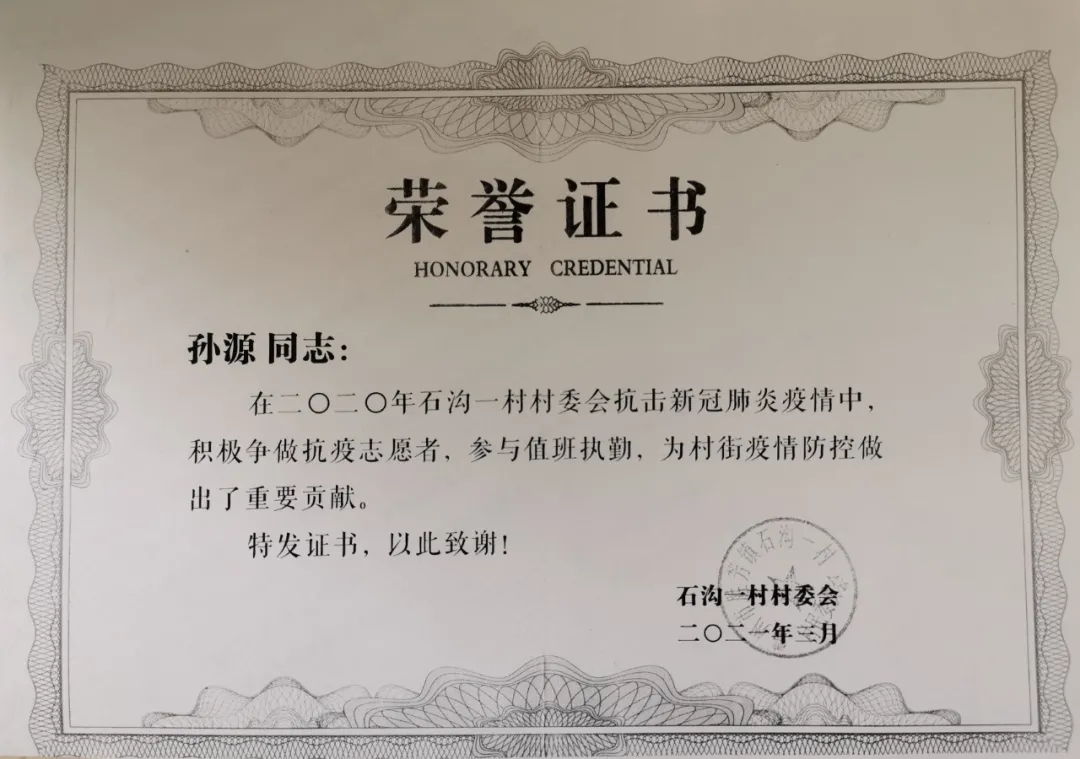在此,感谢贵校孙源同学对石沟一村疫情防控工作中做出的突出努力。更感谢贵校在培养学生的爱国主义、社会责任感等道德素养方面所做的教育工作!