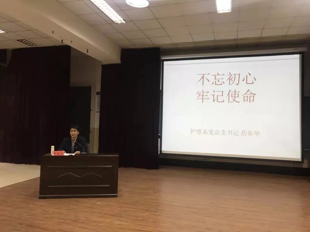 2019年10月17日下午2:00,护理系党总支岳东华书记在阶梯教室学术报告厅,给护理系师生开展了“不忘初心、牢记使命”党课活动。课上,护理系师生认真聆听了岳书记的党课。