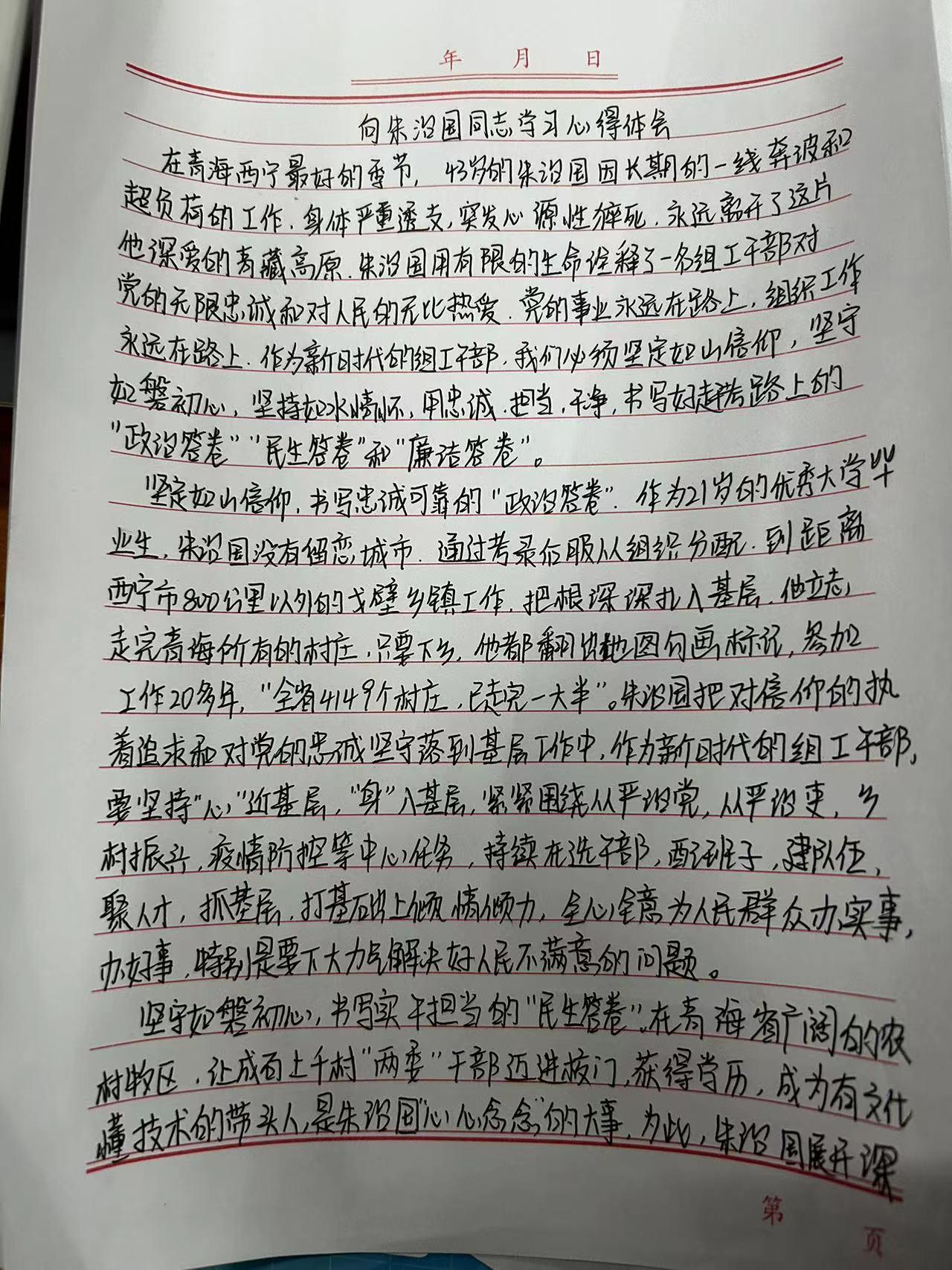 朱治国同志出生在青海省海西州都兰县,在大城市读书生活四年,本可以留在大城市,有更好的就业选择,但他毅然选择前往距离西宁市800公里以外的戈壁乡镇工作,扎根基层,下乡入户、研究党建、深入调研、写报告、拟方案,把个人的未来与国家理想紧密结合,把对党和国家的忠诚融入到工作中。2022年6月11日,因突发心肌梗塞不幸离世,年仅43岁。他用短暂的生命生动的诠释了一名共产党员的初心与使命,责任与担当。