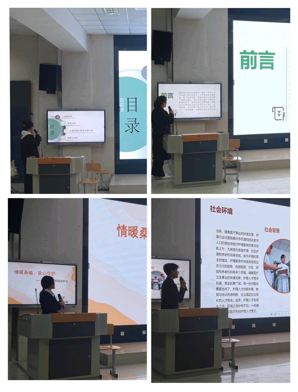 比赛过程中,参赛选手们根据提交的生涯发展报告进行展示。他们结合个人兴趣、专业知识以及护理行业的发展趋势,深入分析了自身的优势与不足,并制定了详细的职业发展路径。大家还通过精美的 PPT、生动的演讲,阐述了自己为实现职业目标将采取的具体行动,如参加专业培训、积累实践经验等。评委老师们认真聆听,从职业规划的科学性、可行性、创新性等多个维度进行了综合评审。