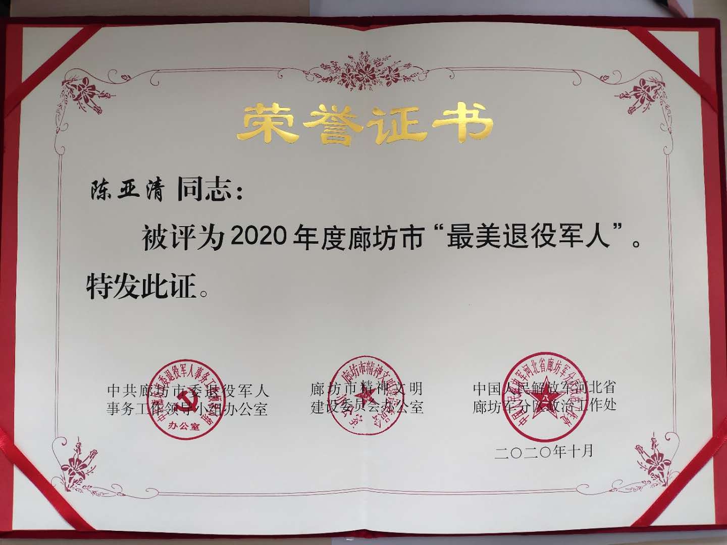 近日,中共廊坊市委退役军人事务工作领导小组办公室、廊坊市精神文明建设委员会办公室、廊坊军分区政治工作处联合发布2020年度廊坊市“最美退役军人”的通报,我院护理系教学科长陈亚清同志被评为了“最美退役军人”。