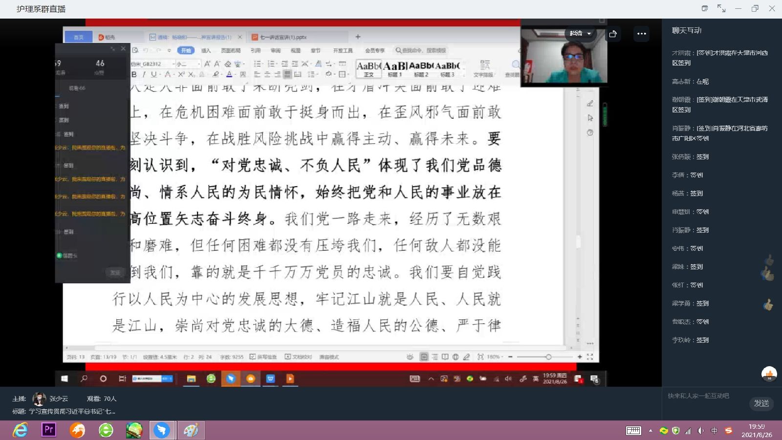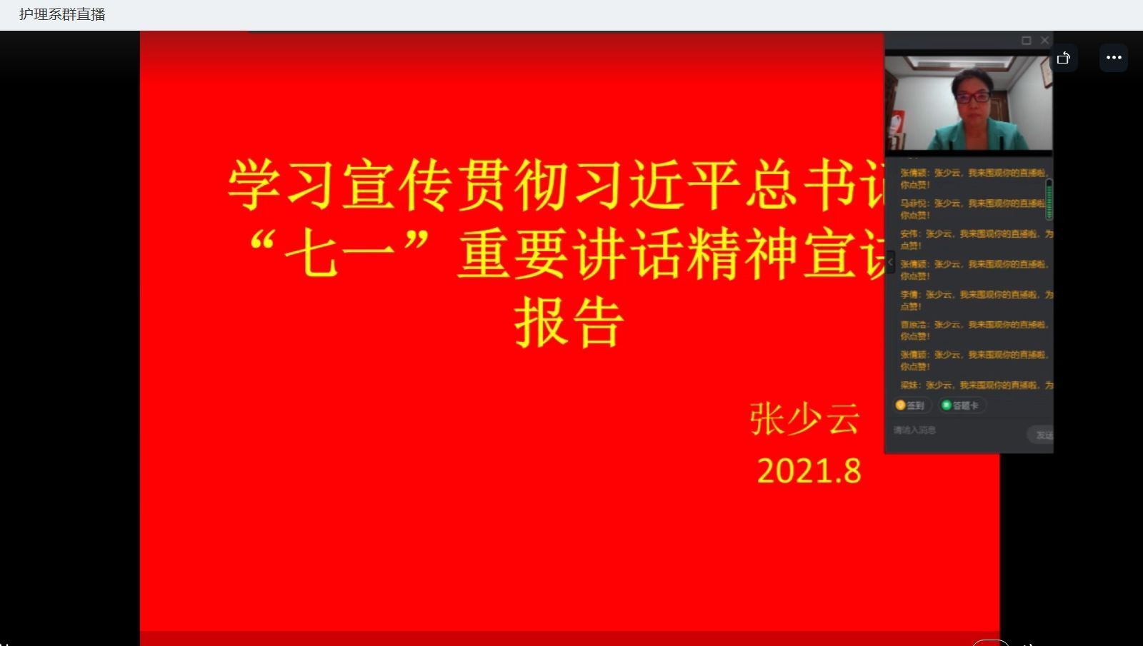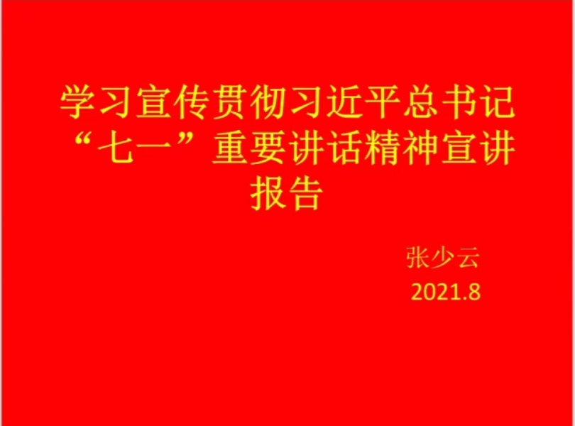 根据学院安排和要求,8月26日晚,在护理系钉钉群,护理系党总支书记张少云同志为护理系全体教职工和护理系学生代表进行了专题宣讲,集体聆听了学习宣传贯彻习近平总书记“七一讲话”重要精神宣讲报告。