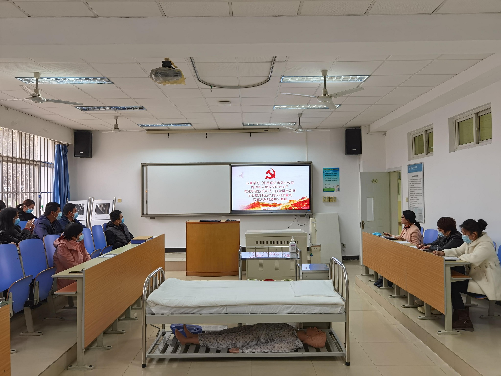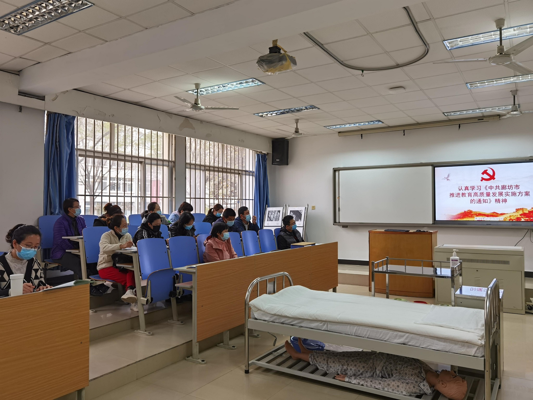 随后,张少云书记带领护理系全体教职员工共同学习了《中共廊坊市委廊坊市人民政府关于印发廊坊市推进教育高质量发展实施方案的通知》和《中共廊坊市委办公室廊坊人民政府办公室印发关于推进职业院校和技工院校融合发展全面提升职业技能培训质量的实施方案的通知》文件精神,加强了全体教职员工政治理论学习水平。