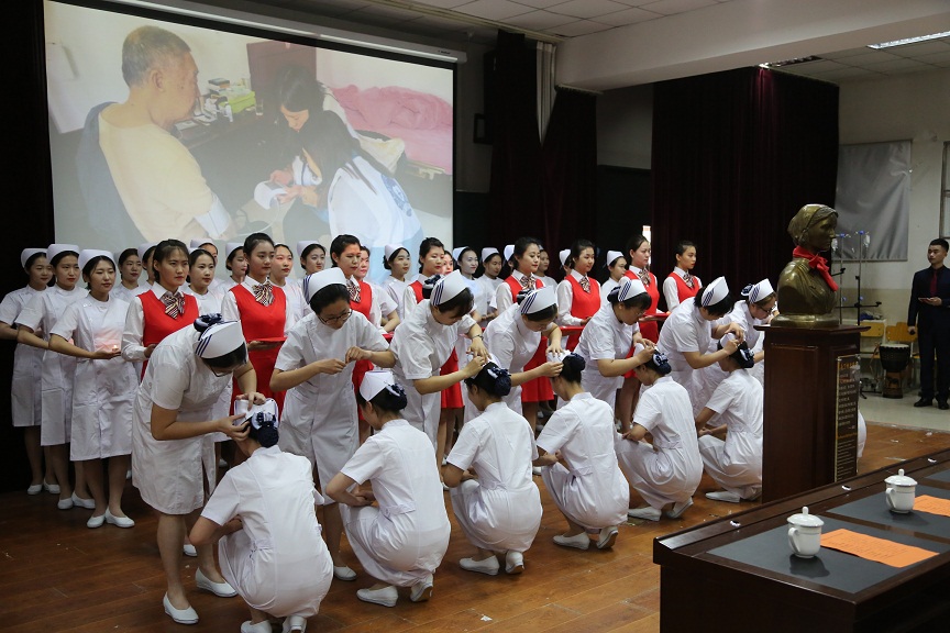 在熠熠烛光中,神圣庄严的授帽仪式拉开帷幕。伴随着庄严的乐曲,护理教师为护生们戴上了象征圣洁的燕帽,点燃了象征南丁格尔手中那盏明灯的红烛,随后学生向老师们献花表达敬意和感激。全场同学庄严宣誓,誓言也表达了他们愿为护理事业奉献青春和热血的决心。庄严的气氛让现场每个人心灵进一步净化,深感白衣天使这个职业的崇高和光荣。