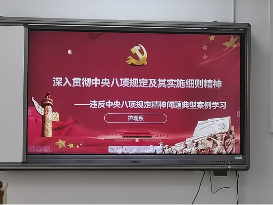 为进一步深化党风廉政建设,筑牢教职工廉洁自律意识,护理系于5月15日组织全体教职工开展“深入贯彻中央八项规定及其实施细则精神”专题学习教育。由护理系书记张少云、主任柴润国、副主任满帅、学生党支部书记张萍、教师党支部书记王永芳带领大家共同学习。