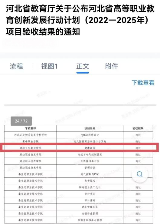 根据《河北省教育厅关于开展高等职业教育创新发展行动计划(2022-2025年)项目申报工作的通知》,廊坊卫生职业学院积极响应省里号召组织项目申报。经学院申报、数据审核、专家评审和结果公示等环节,临床医学系贾云波老师负责的《中医传承大师工作室》和马杰老师负责的在线课程《健康评估》两个项目成功入选。