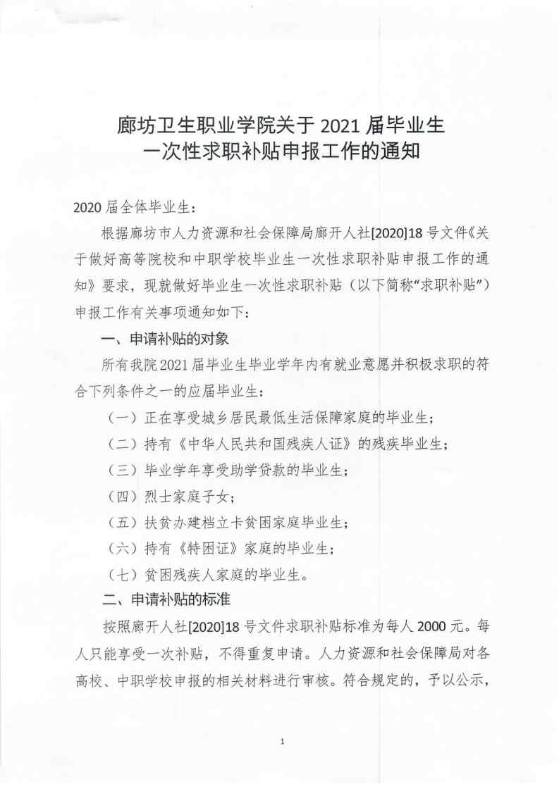廊坊卫生职业学院关于2021届毕业生一次性求职补贴申报工作的通知