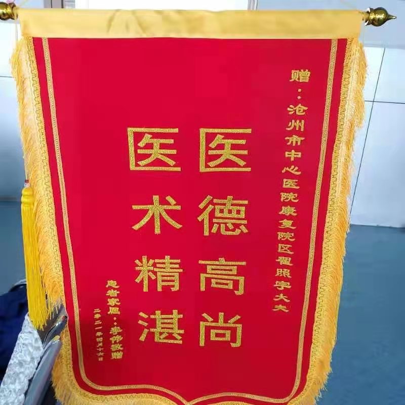 这面锦旗内容为“医德高尚,医术精湛”,代表的是病人家属对于翟照宇技术的高度认可,医院方面对翟照宇同学的评价为“治疗师翟照宇虽然年轻刚刚步入工作岗位,但工作认真负责,患者对他的治疗技术和服务都给予很大的肯定。”