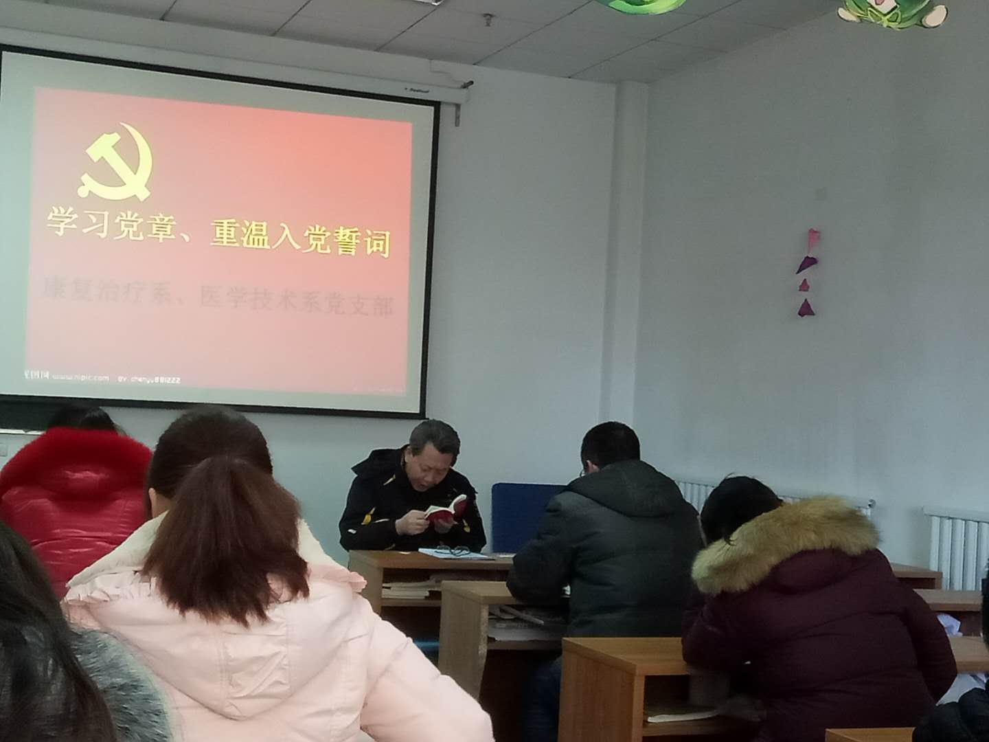 2017年12月28日,为深入学习宣传贯彻党的十九大精神,切实增强党员党性观念。康复治疗系、医学技术系党支部组织召开党员学习大会,专题学习了新修订的党章,会议由两系党支部书记程继勇主持。