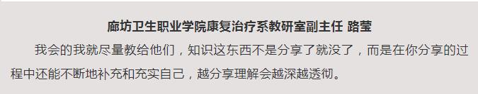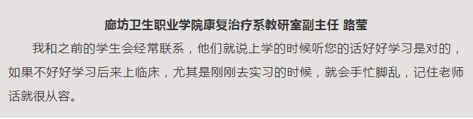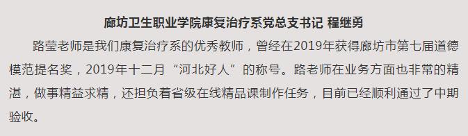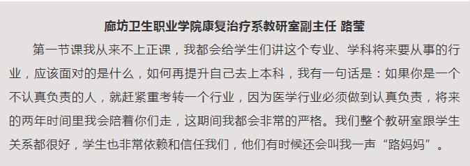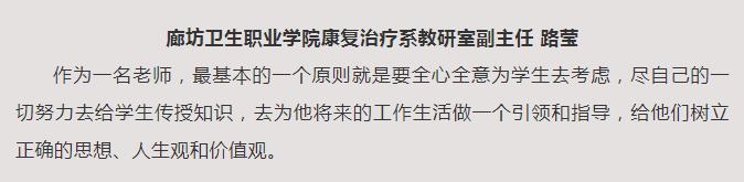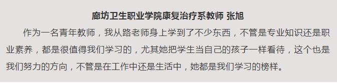 路莹——廊坊卫生职业学院康复治疗系教研室副主任,是学院康复治疗专业及“彩虹行动”创始人之一。1995年8月参加工作以来,路莹从事临床工作14年、教学工作10年。无论从事医生还是教师工作,她都尽职尽责,用实际行动解除患者病痛为学生指引未来道路。