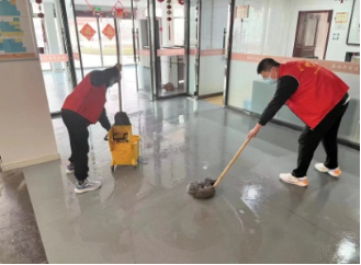 志愿者们合力打扫敬老院,帮助工作人员擦地,擦桌子,为老人营造干净、舒适的生活环境。