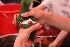 “粽叶飘香迎端午”包粽子比赛于12:50在阶梯教室北广场正式开始,共分为教师教学、小组比赛、集体练习三个部分,每系代表15名同学组成参赛小组。首先,康复治疗系代表教师对包粽子的技巧与方法进行讲解,接下来由参赛同学进行比赛,比赛结束后,参赛同学及观赛同学可以共同参与包粽子。包粽子一方面锻炼手指的灵活性,融入了康复治疗系的专业特色,另一方面使同学们在包粽子的过程中体会端午节的文化习俗。