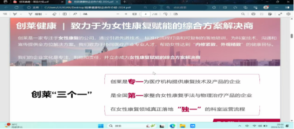 公司负责人滕总对此次洽谈表示了高度重视,他表示“创莱健康”与康复治疗技术专业毕业生契合度高,希望有更多毕业生到企业就业。刘总对公司情况了做简要介绍,并通过以往的合作案例展示了校企合作带来的成效。