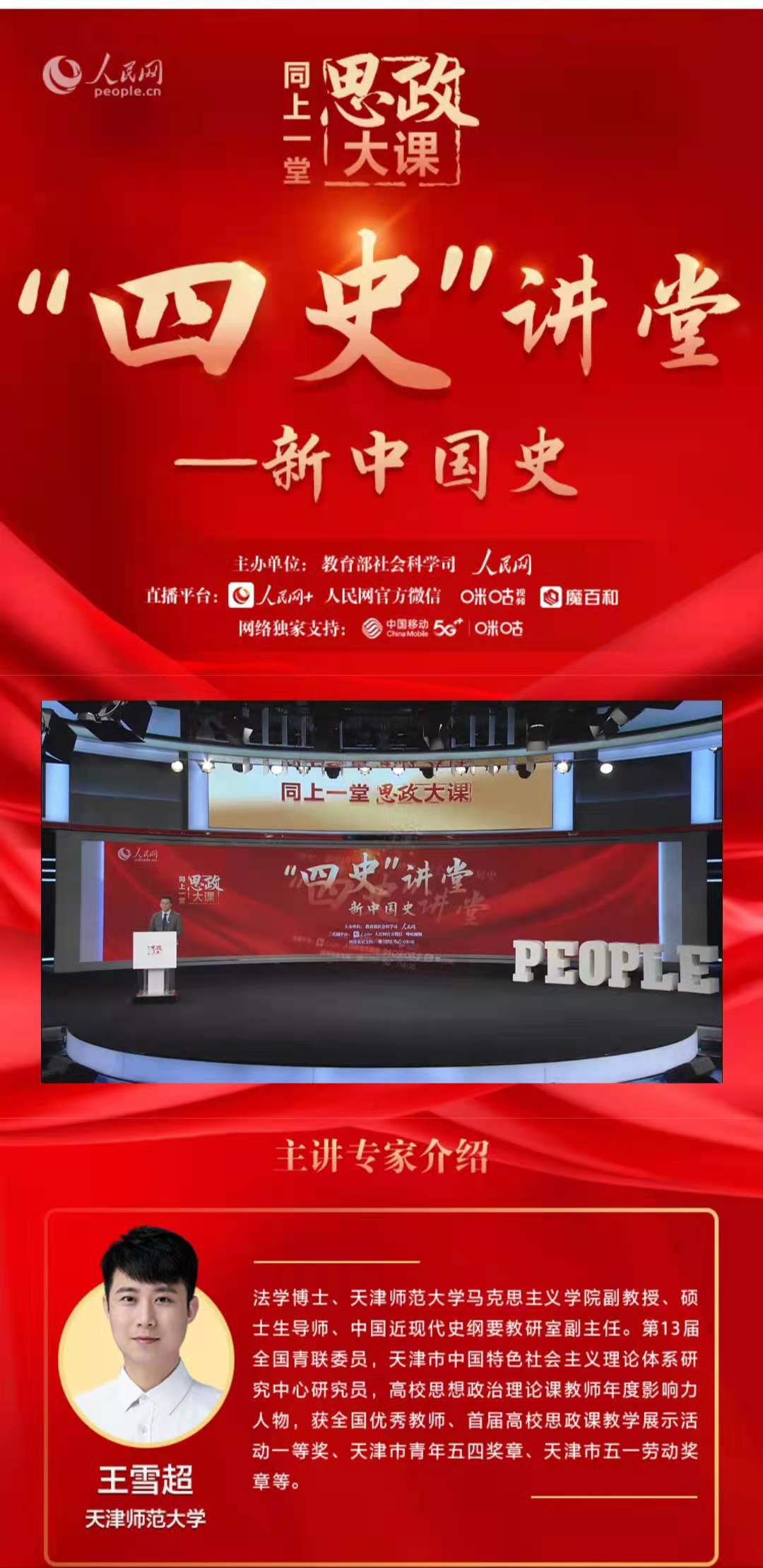 这次课程由天津师范大学王雪超、上海师范大学张志丹和复旦大学肖存良三位老师讲授。课程围绕着中华人民共和国71年的历史,即中国共产党团结带领全国各族人民进行革命、建设和改革并取得巨大成就的历史展开,带领我们重新回顾党领导全国各族人民群众,进行艰苦卓绝的奋斗和波澜壮阔的建设历程。