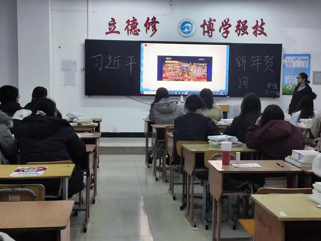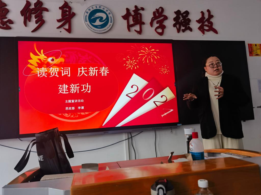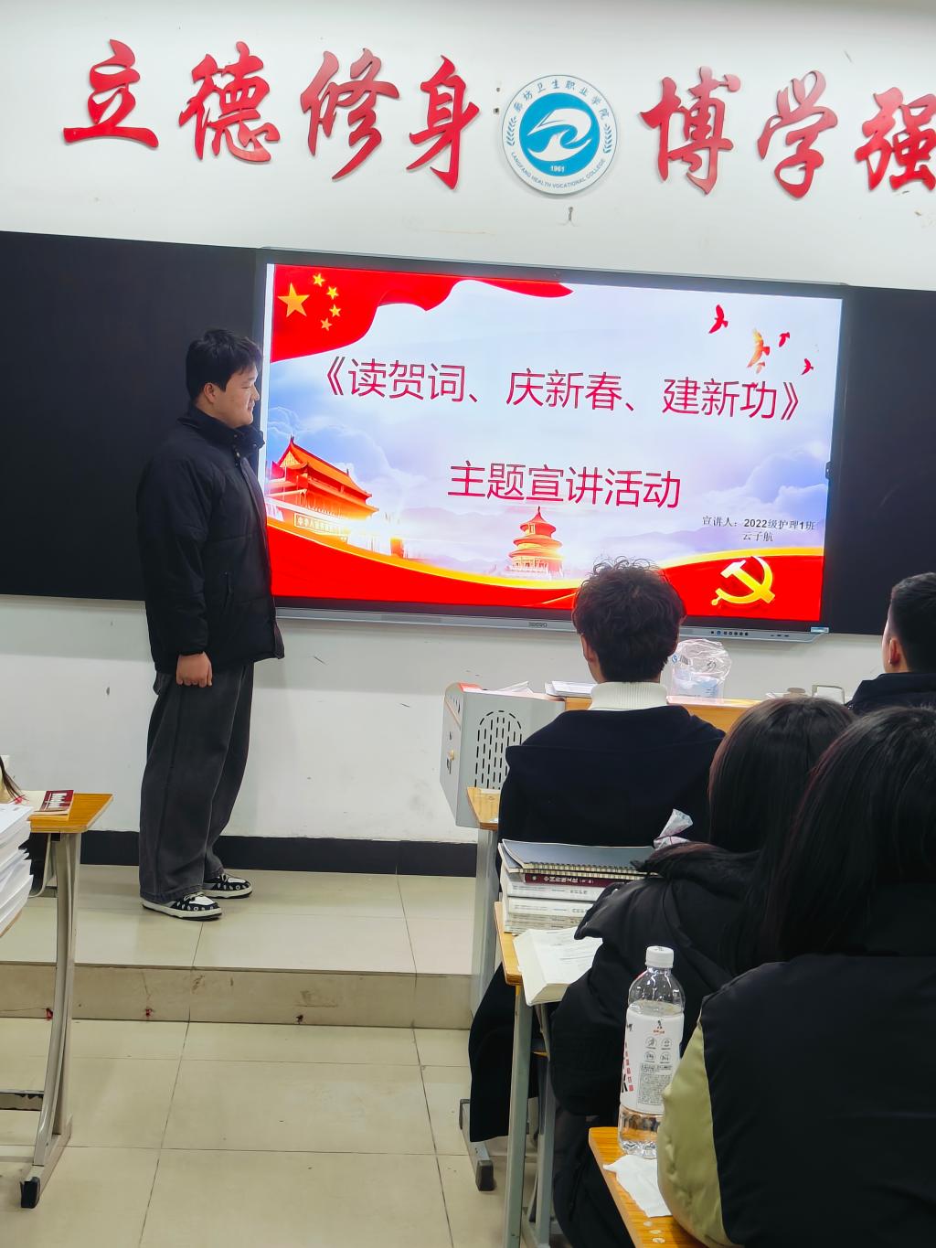 为深入学习贯彻习近平总书记二〇二四年新年贺词精神,按照市委宣传部《关于开展“读贺词、庆新春、建新功”主题宣讲服务活动的通知》要求,引导全校师生牢记嘱托、感恩奋进,近日,思政部按照学院党委的安排部署,在学院五系配合下,开展了“读贺词、迎新春、建新功”主题宣讲服务活动。活动分为两个阶段,第一阶段,各系以班级为单位进行新年贺词的学习;第二阶段,知行社学生宣讲员和教师宣讲员进入班级进行宣讲。全院4900余名学生、12名学生宣讲员、6名教师宣讲员踊跃参与到活动中,收到良好效果。