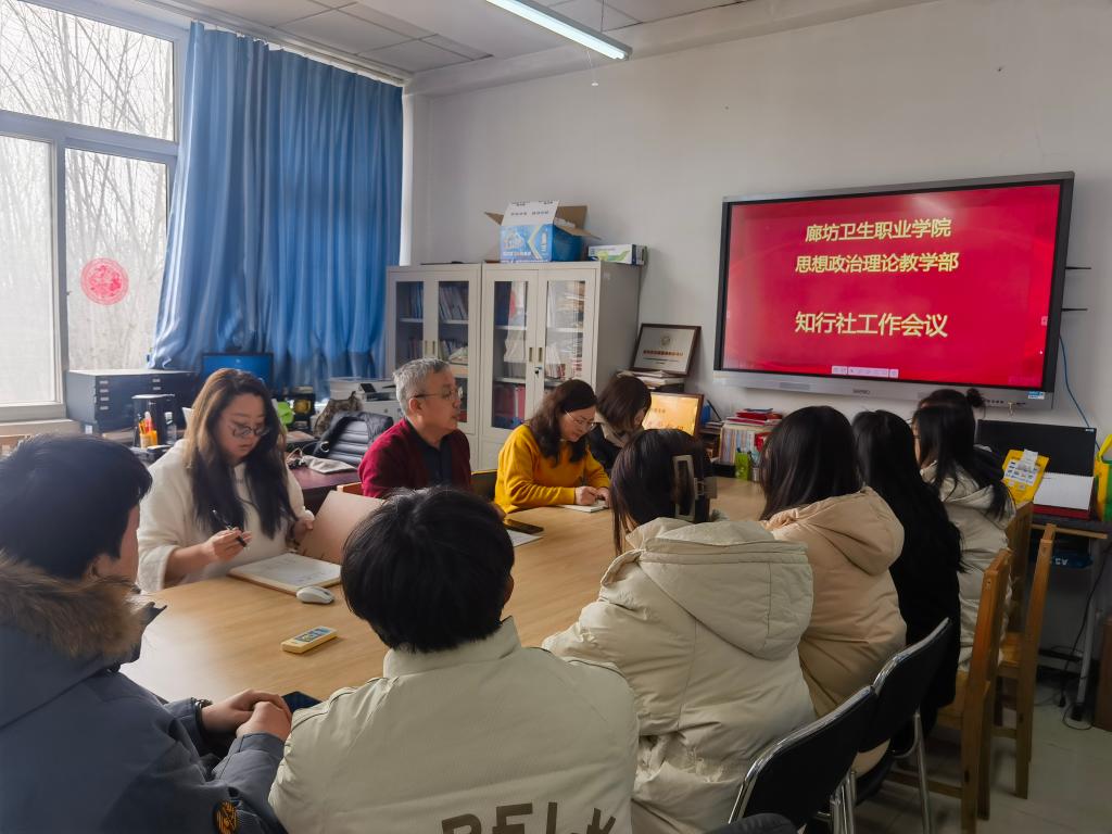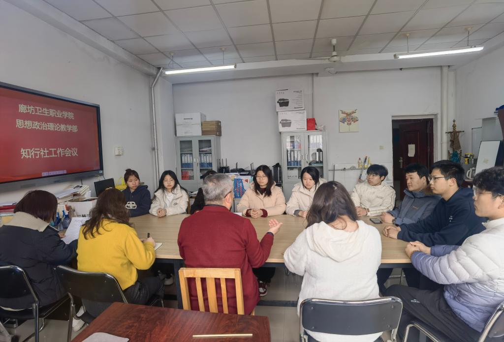 2024年3月4日,思政部组织召开知行社工作会议,会议由思政部主任王冬杰教授宣读了《廊坊卫生职业学院思想政治理论教学部关于“知行社”社团机构设定与人员名单的决定》。