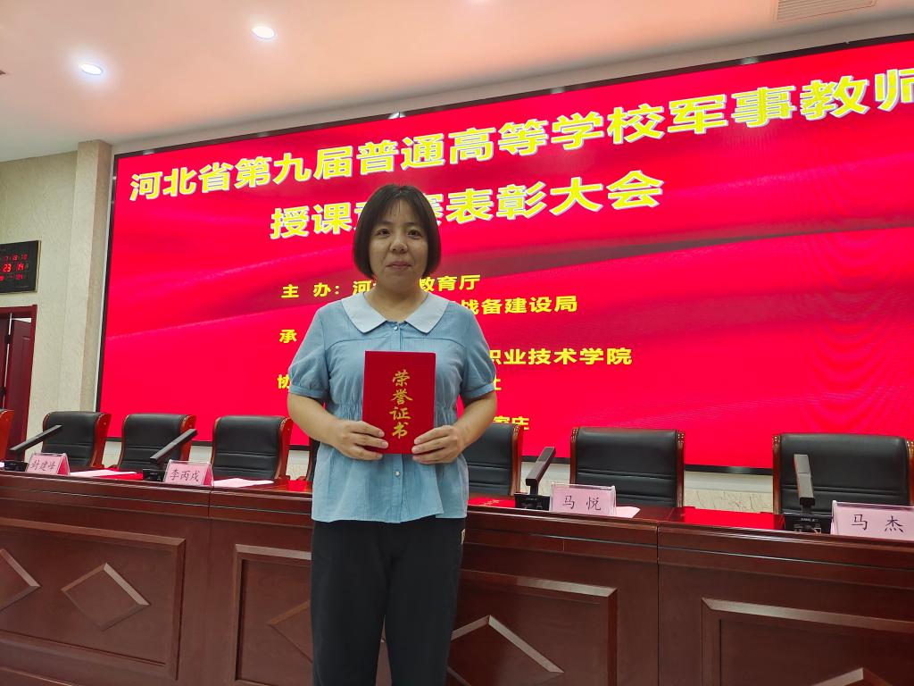 思政部教师王芳倩在河北省教育厅、河北省军区战备建设局联合举办的 2025 年河北省普通高等学校军事教师培训暨军事教师授课竞赛中,凭借出色的表现脱颖而出,荣获一等奖。