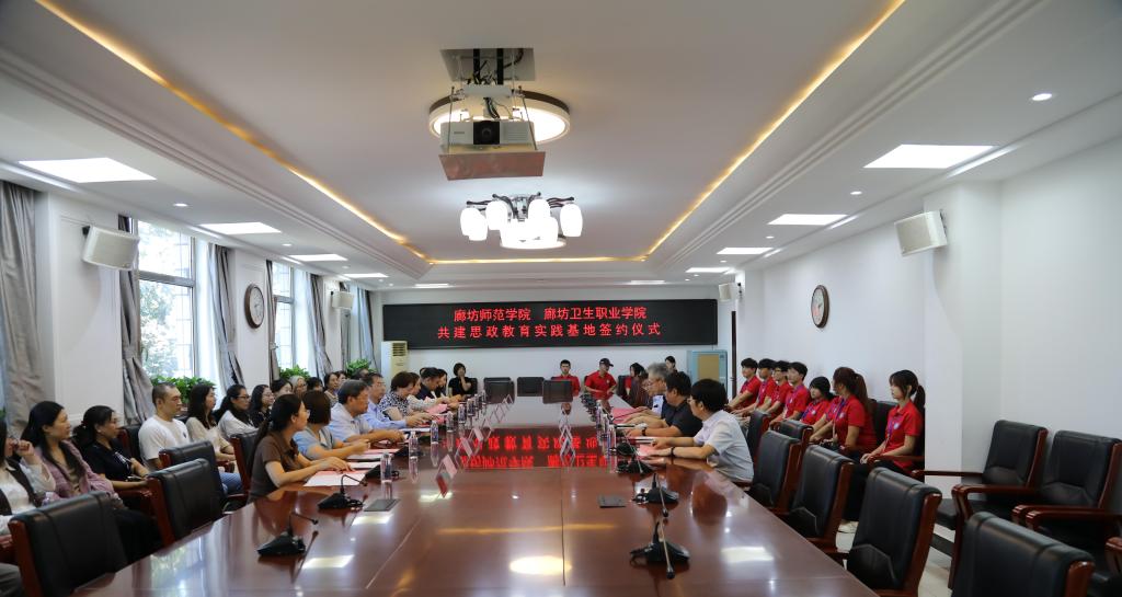 为深化思想政治理论课教学改革,整合优质文化资源,构建实践育人新格局,2025年9月18日下午,廊坊卫生职业学院与廊坊师范学院共建“思想政治理论课实践教学基地”揭牌仪式在廊坊师范学院隆重举行。廊坊卫生职业学院党委委员、副院长纪连永、廊坊师范学院党委常委、副校长张增良出席仪式并致辞。仪式由廊坊师范学院国际教育交流中心主任赵文华主持。思政部主任付立侠、医学基础部主任王玉江携师生代表40余人参加活动。