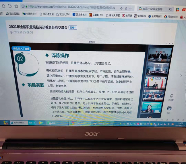 为全面贯彻党的教育方针,落实《中共中央 国务院关于全面加强新时代大中小学劳动教育的意见》《大中小学劳动教育指导纲要(试行)》,总结交流各地各职业院校劳动教育经验做法和成效,展示工作成果,进一步突出职教类型特点,推进新时代职业院校劳动教育工作模式改革创新,全国职业院校劳动教育经验交流会于10月25日以线上形式召开。思政部劳动教育教研室主任周璐参加了此次线上交流会。