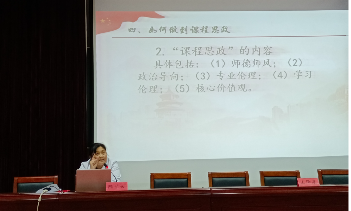 2021年10月14日下午,在我院学术报告厅开展了一场课程思政主题培训讲座,主讲人为思政部陈兰云教授。她从“什么是课程思政、为什么要进行课程思政、怎样进行课程思政”三方面进行了解读,为课程思政工作的顺利开展给出了建设性意见,得到与会领导与教师的一致好评。
