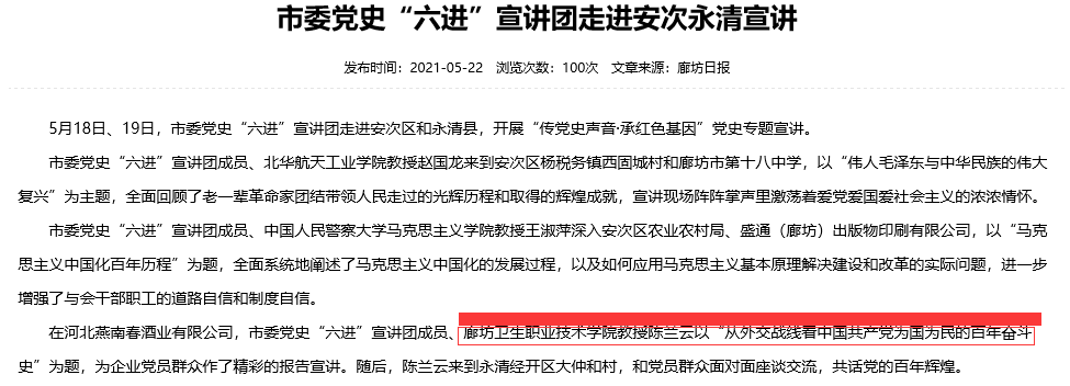 5月19日,我院思政部教研室主任、市委党史“六进”宣讲团成员陈兰云教授,走进永清县,开展“传党史声音·承红色基因”党史专题宣讲。