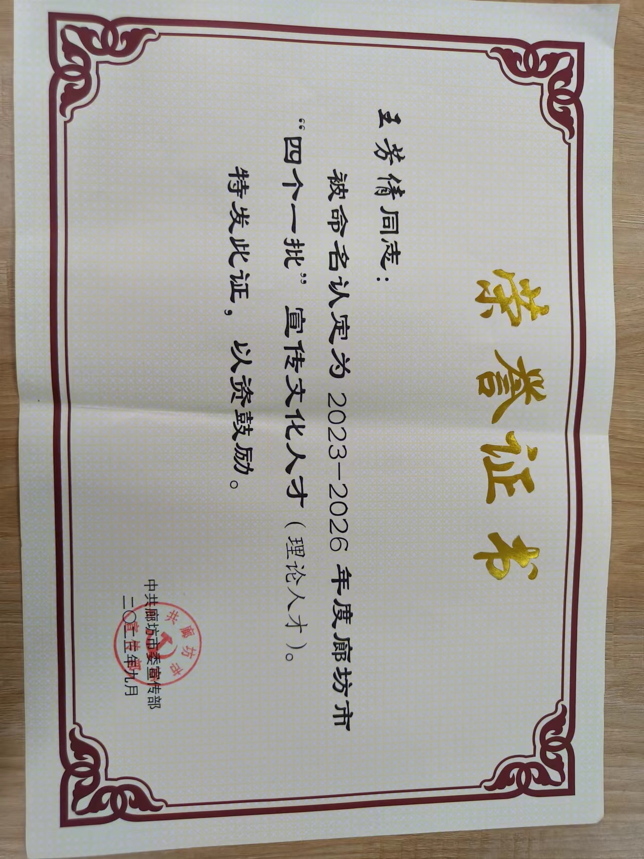根据《廊坊市“四个一批”人才培养选拔管理办法(试行)》要求,2023年,廊坊市党委宣传部深入开展选拔工作。思政部思想道德与法治教研室主任王芳倩老师被命名认定为2023-2026年度廊坊市“四个一批”理论人才。在此,向王芳倩老师表示热烈祝贺,并希望她在今后的工作中再接再厉,取得更优秀的成绩。