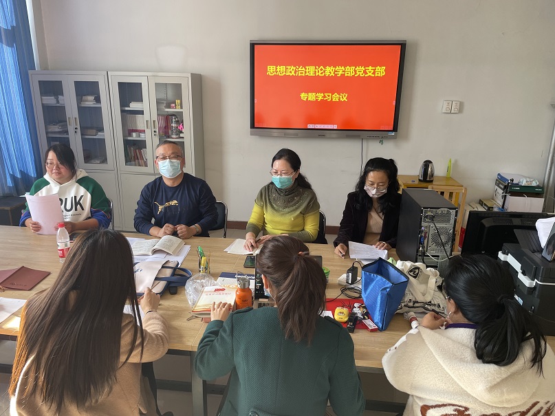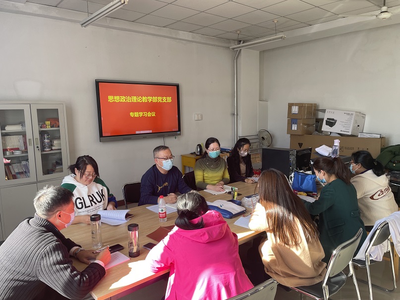 2021年10月30日,思政部党支部在思政部三楼资料室组织召开了全体党员及入党积极分子参加的专题学习会议,内容包括习近平总书记在纪念辛亥革命110周年大会上的重要讲话、习近平总书记在中央人才工作会议上的重要讲话、习近平总书记在中共中央政治局第三十三次集体学习时的重要讲话以及总书记在考察陕西榆林、黄河入海口时发表的重要讲话。党支部负责人、思政部主任王冬杰教授在学习后要求老师们要深入理解、贯彻落实总书记的讲话精神内涵,并将学习内容与当前讲授的思想道德与法治、形势与政策、劳动教育及职业生涯与就业指导课程内容相结合,做到学懂弄通做实,做到真学真信真用,使讲话精神内涵入脑入心、真正落地。