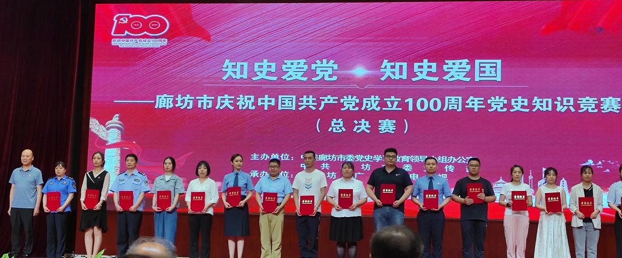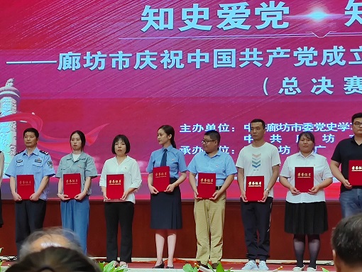 6月24日,思政部教师王芳倩、周璐代表市委教育工委参加廊坊市党史知识竞赛决赛,最终获得优秀奖。