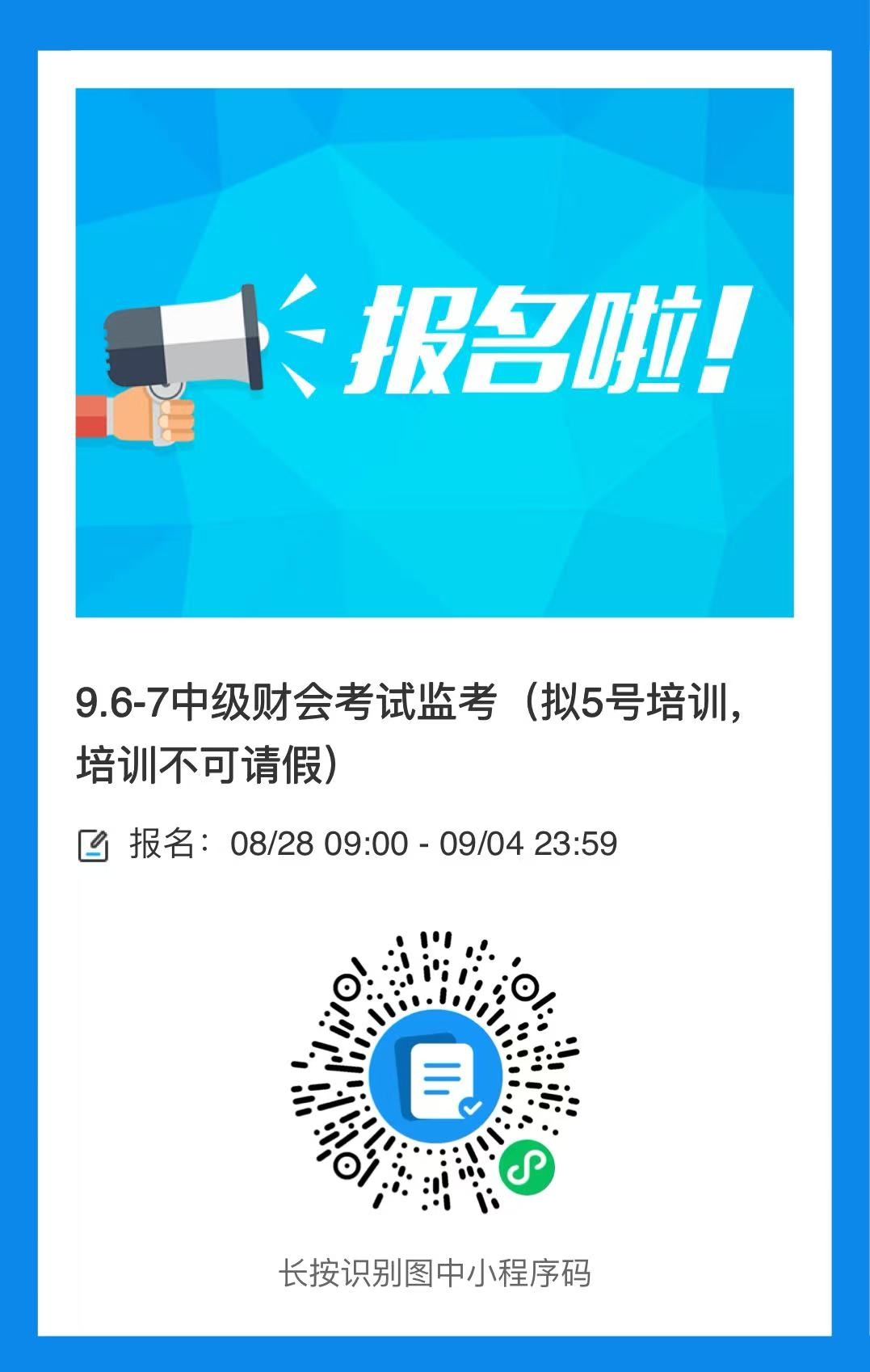 培训时间:约为9月5日周五(具体时间待定),一般为上午9点在财政局培训(培训时间约1小时),下午现教综合楼布置考场(一般为两点半左右开始,布置时长约1小时左右)。具体准确时间会再通知。