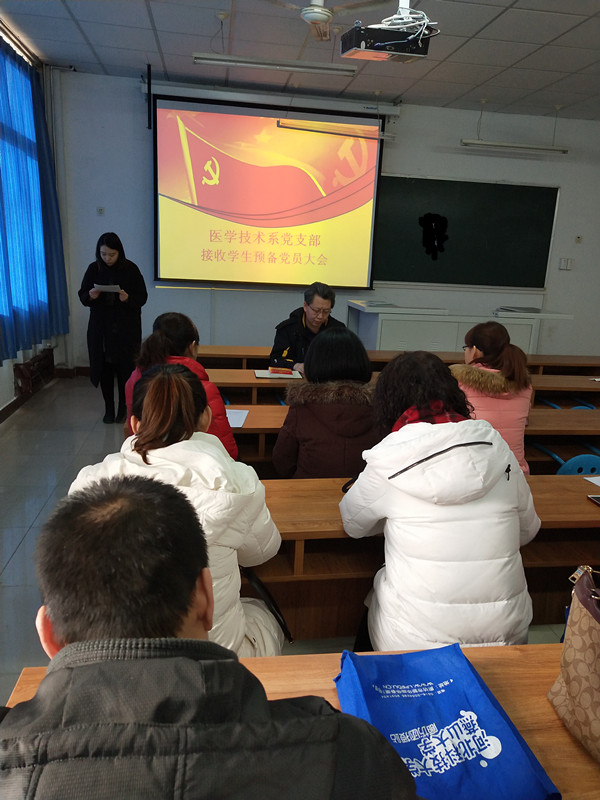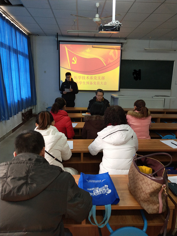 1月18日,医学技术系党支部在2号实验楼影像多媒体教室召开接收预备党员大会,主要讨论接收李嘉峰、肖迪二为同志为预备党员。我系党支部共有党员13名,实到党员13名,超过半数,按照《中国共产党党章》和《中国共产党发展党员工作细则》的有关规定,会议有效。列席参加大会的还有我支部正在培养的两位入党积极分子,会议由党支部书记程继勇主持。